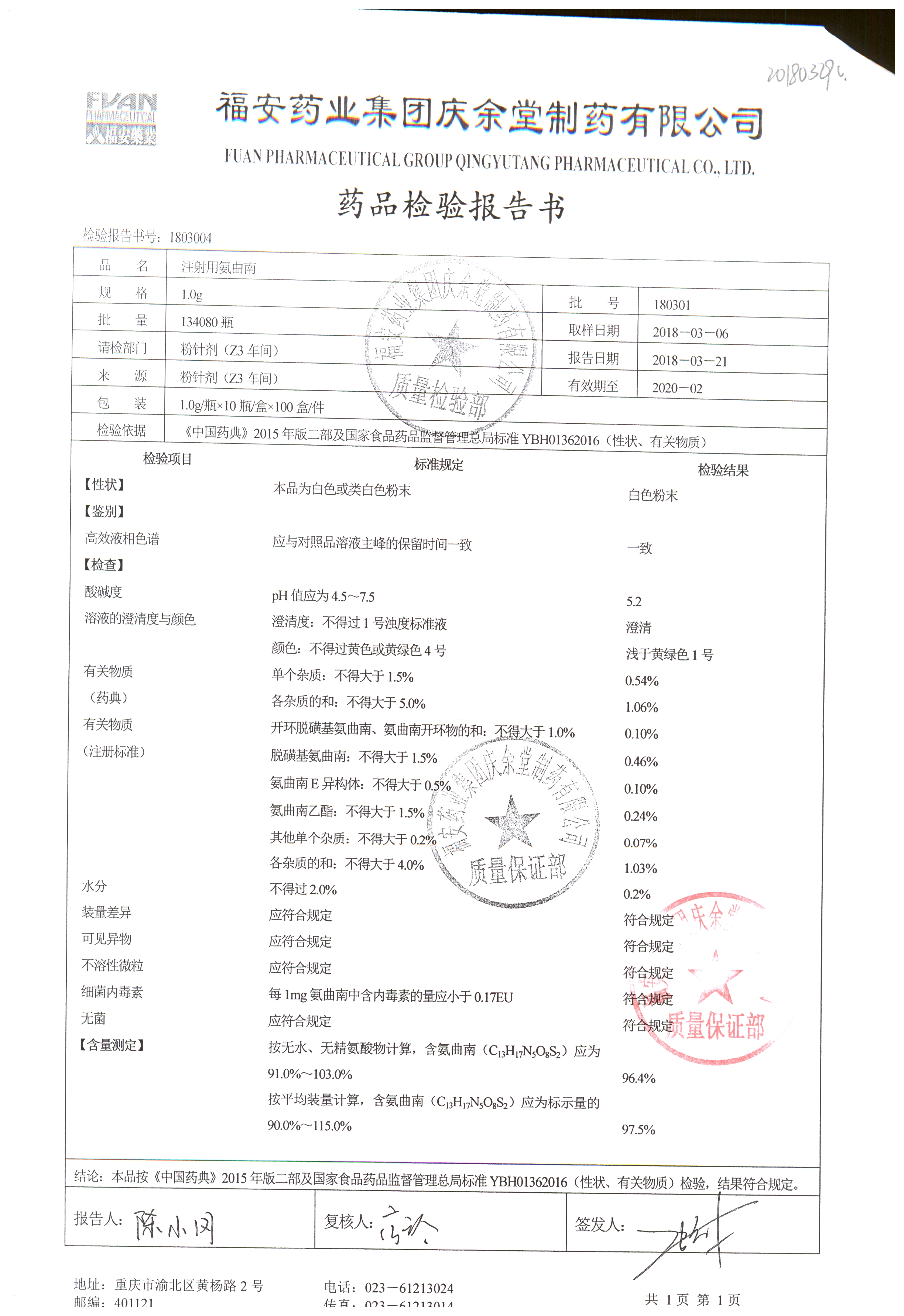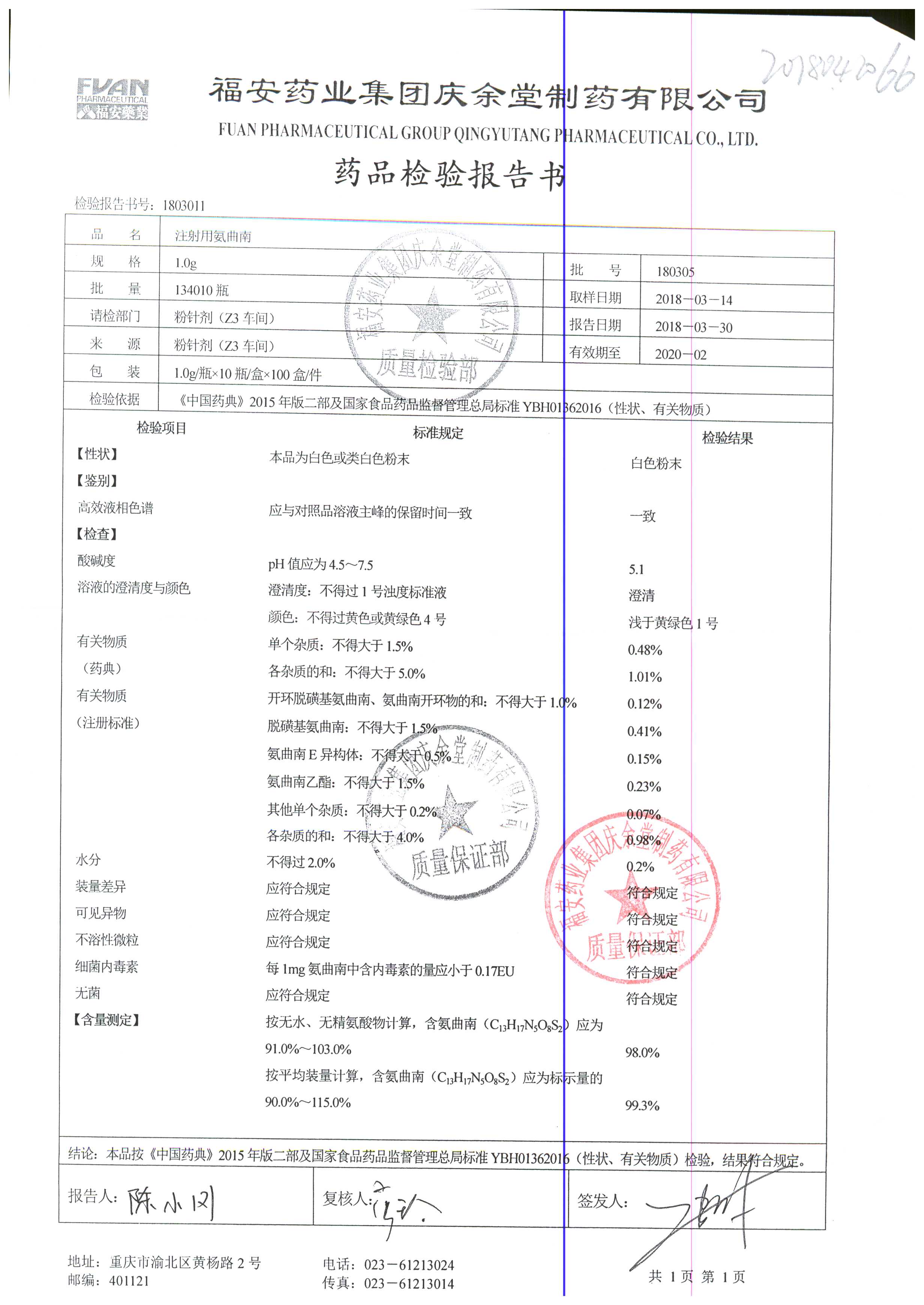 注射用氨曲南 1.0g 180303 查看詳情