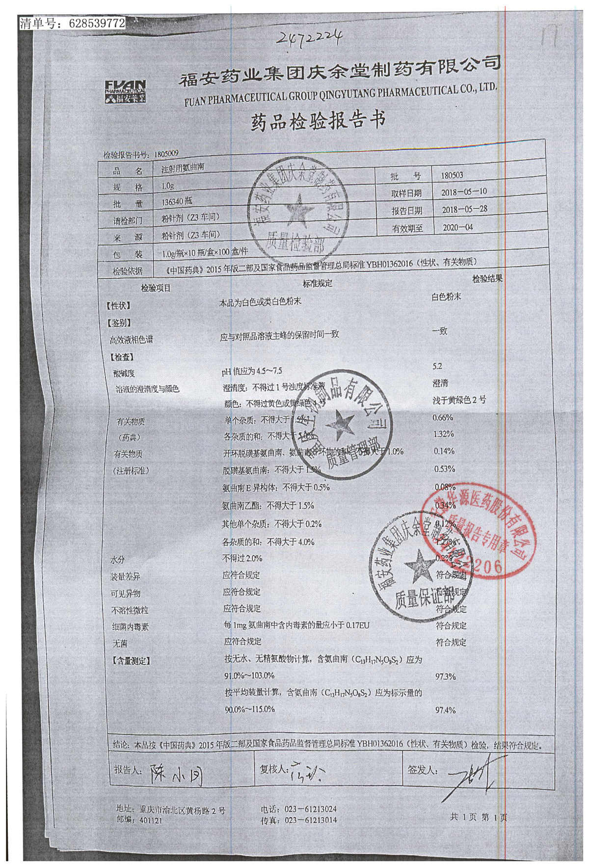 注射用氨曲南 1.0g 180503 查看詳情