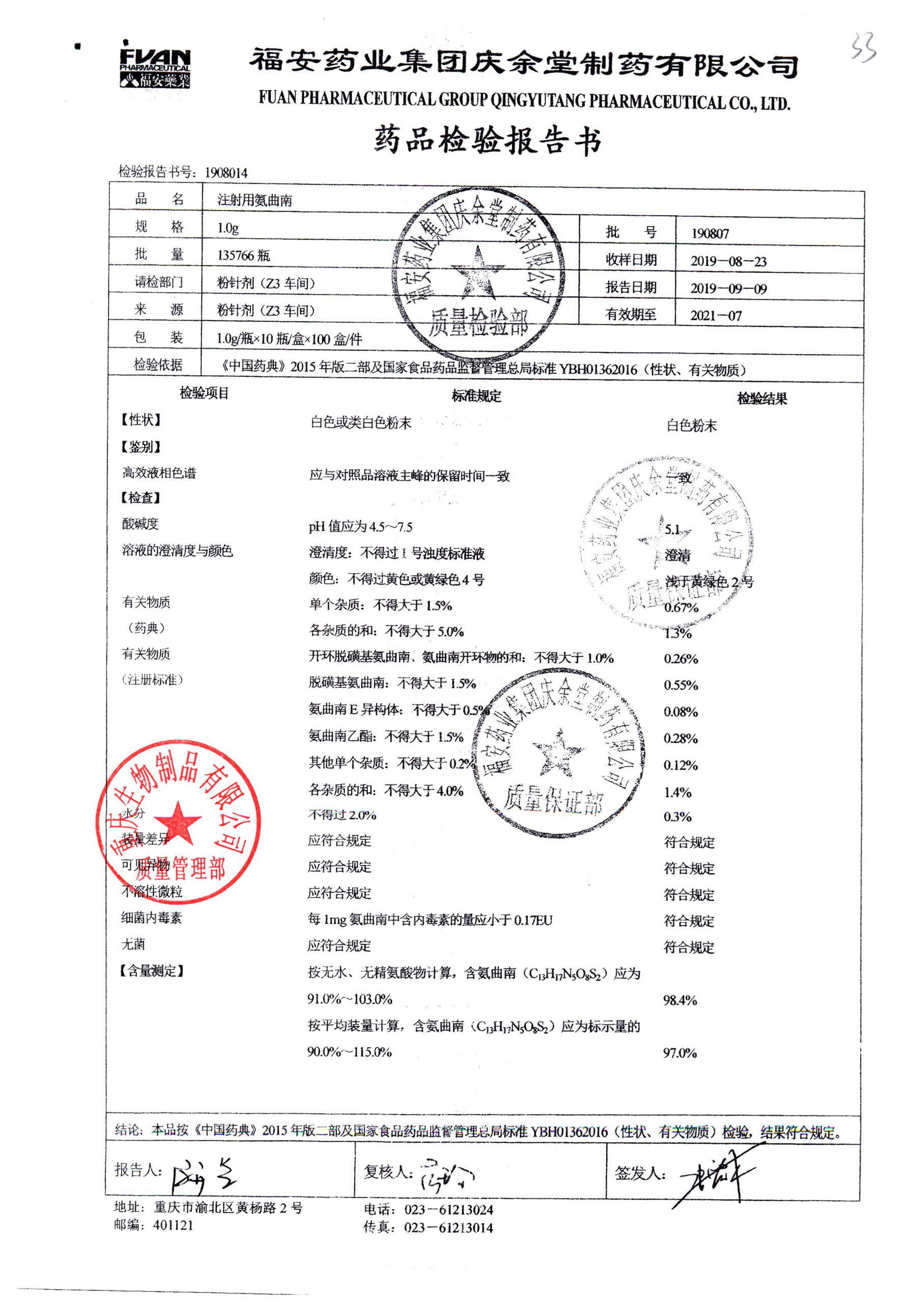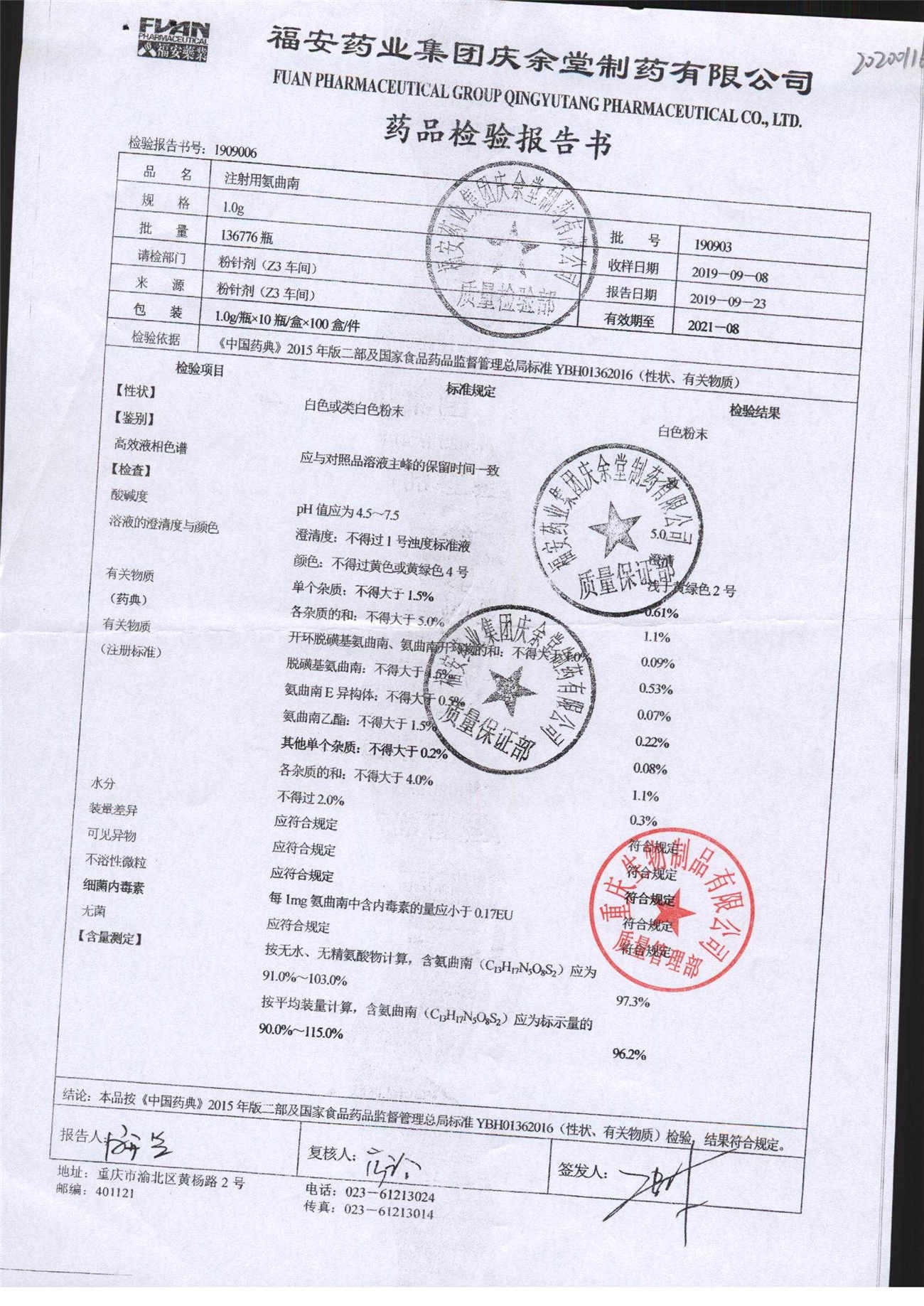 注射用氨曲南 1.0g 190807 查看詳情