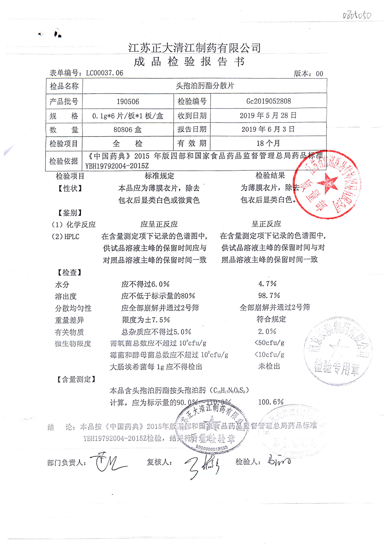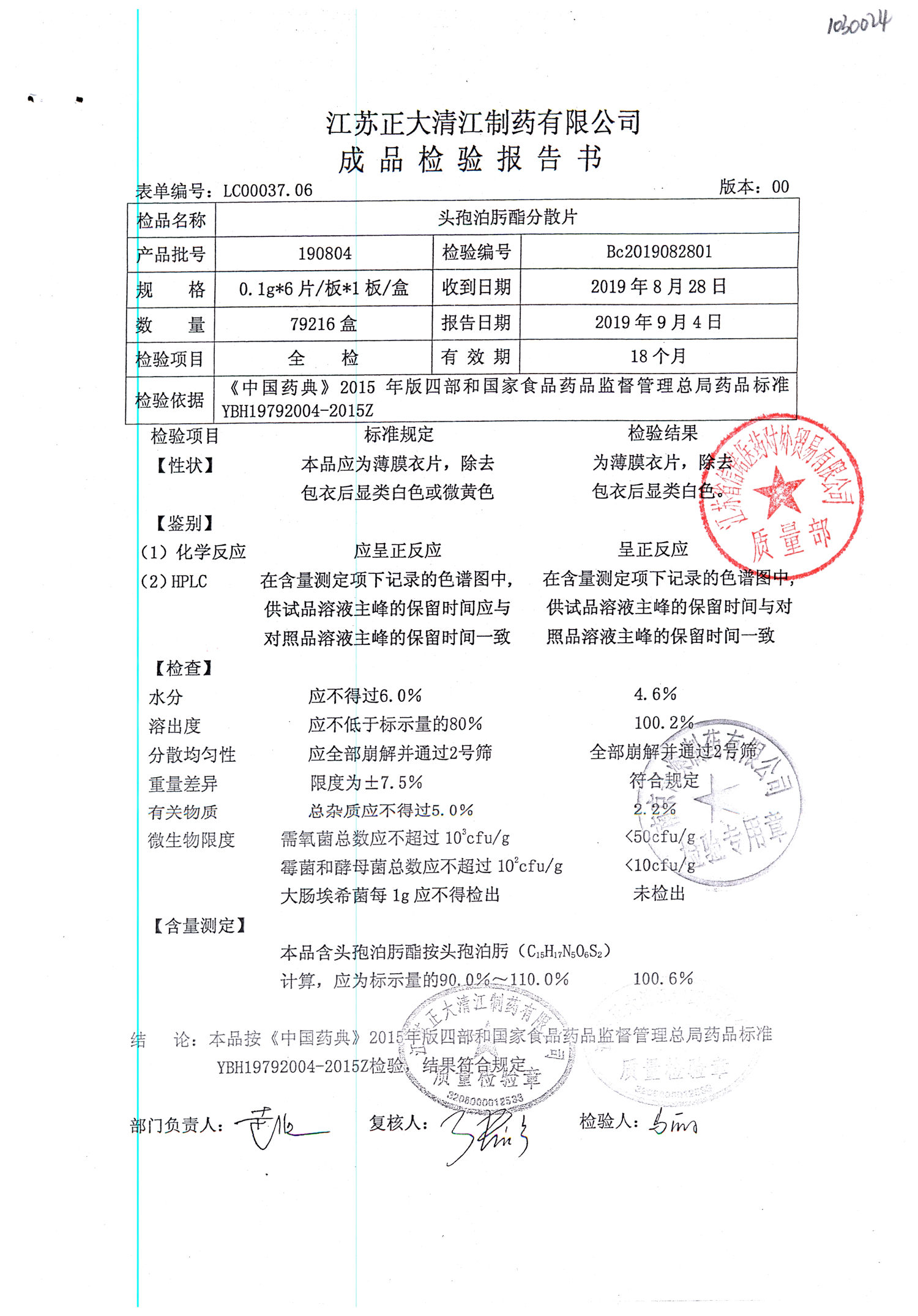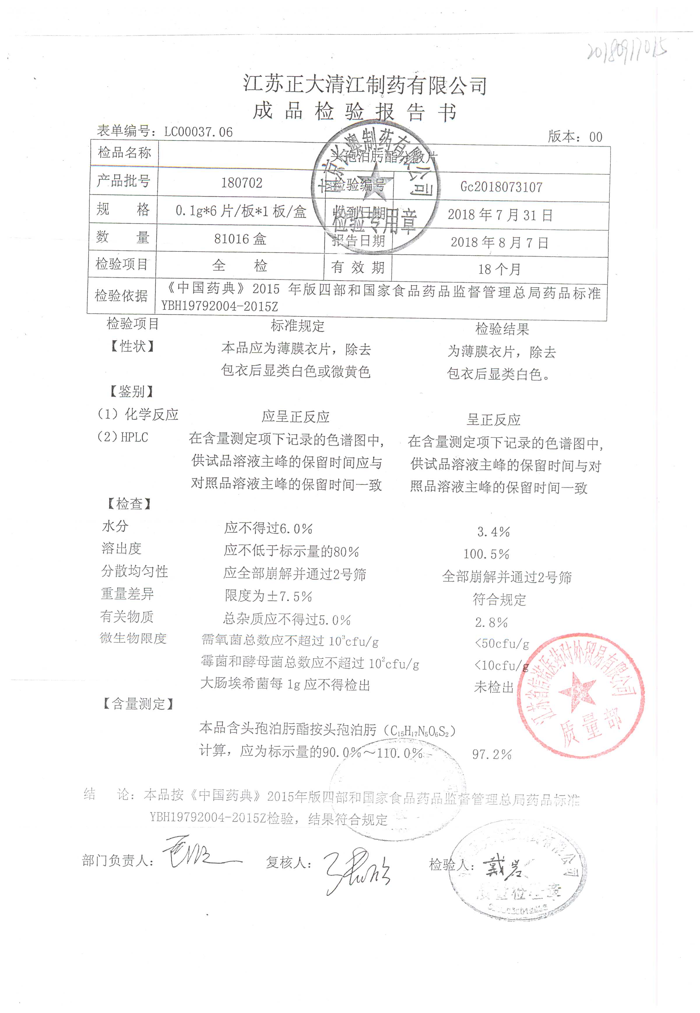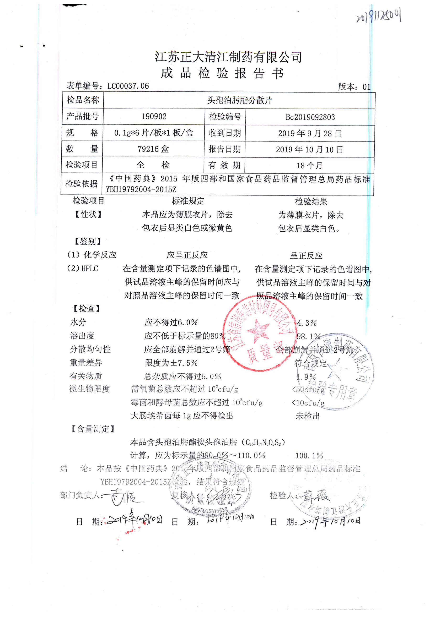 頭孢泊肟酯分散片 | 0.1g*6s | 190803 | 查看詳情 |