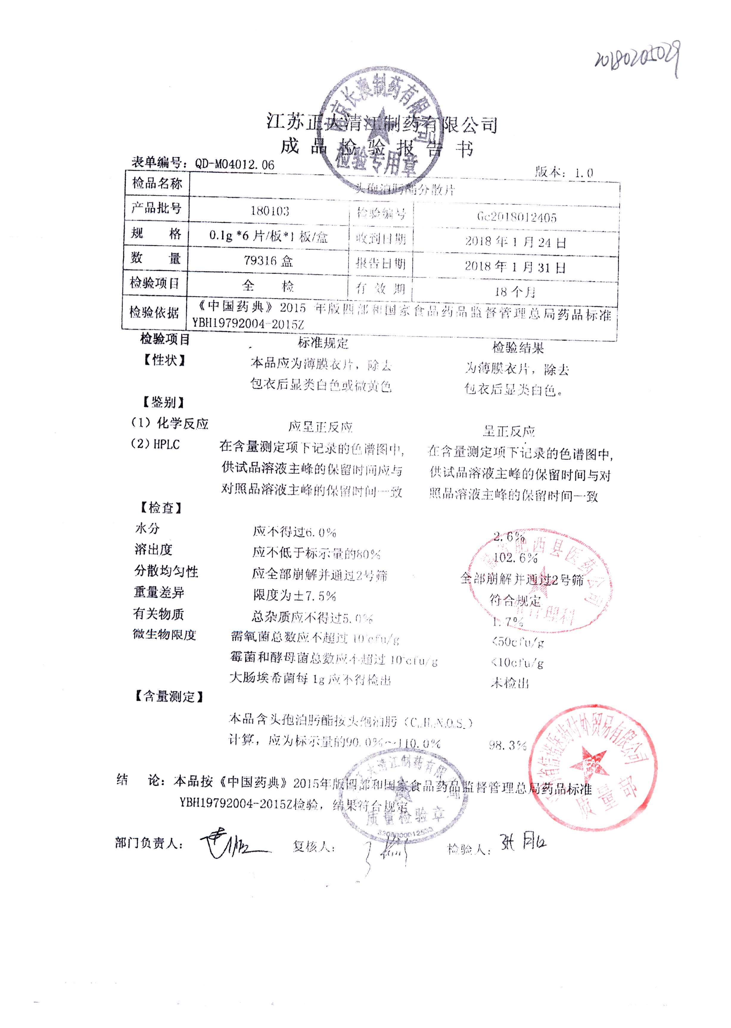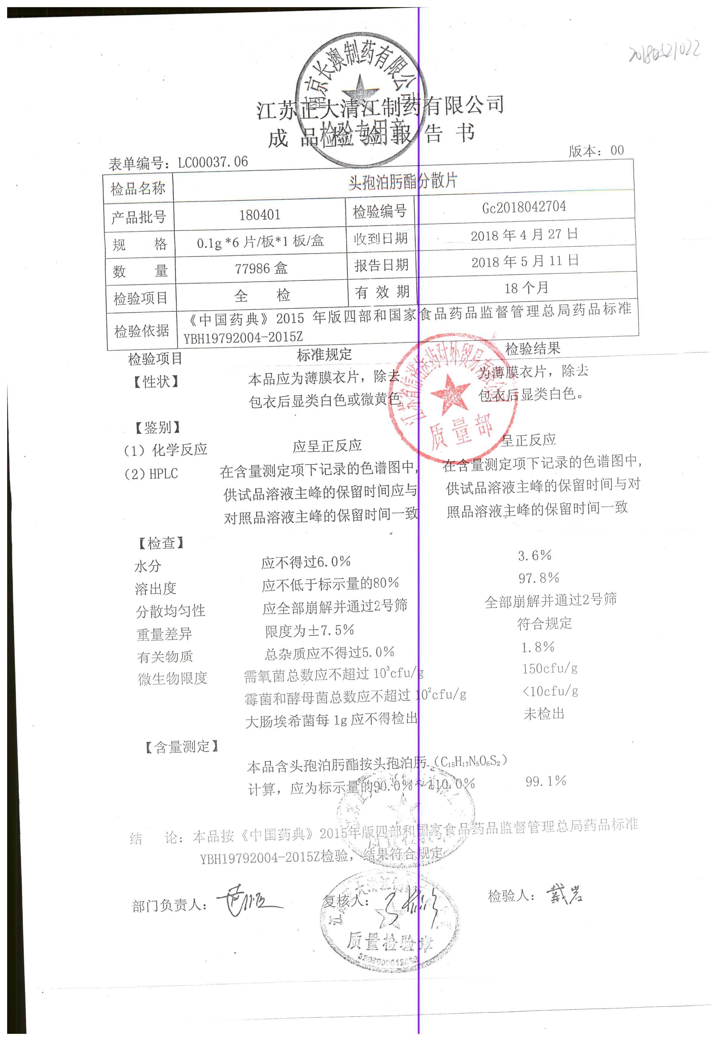 頭孢泊肟酯分散片 | 0.1g*6s | 180804 | 查看詳情 |