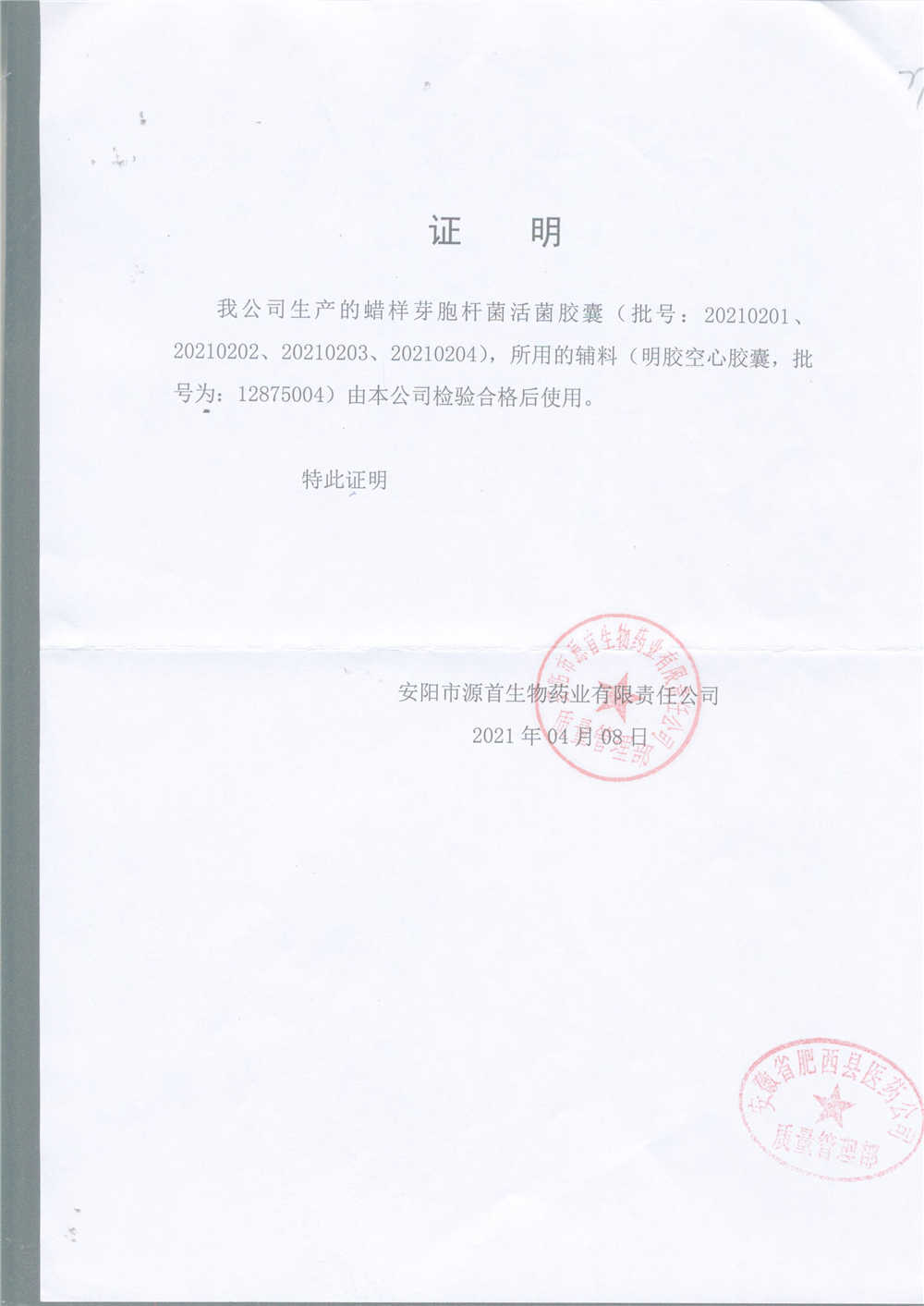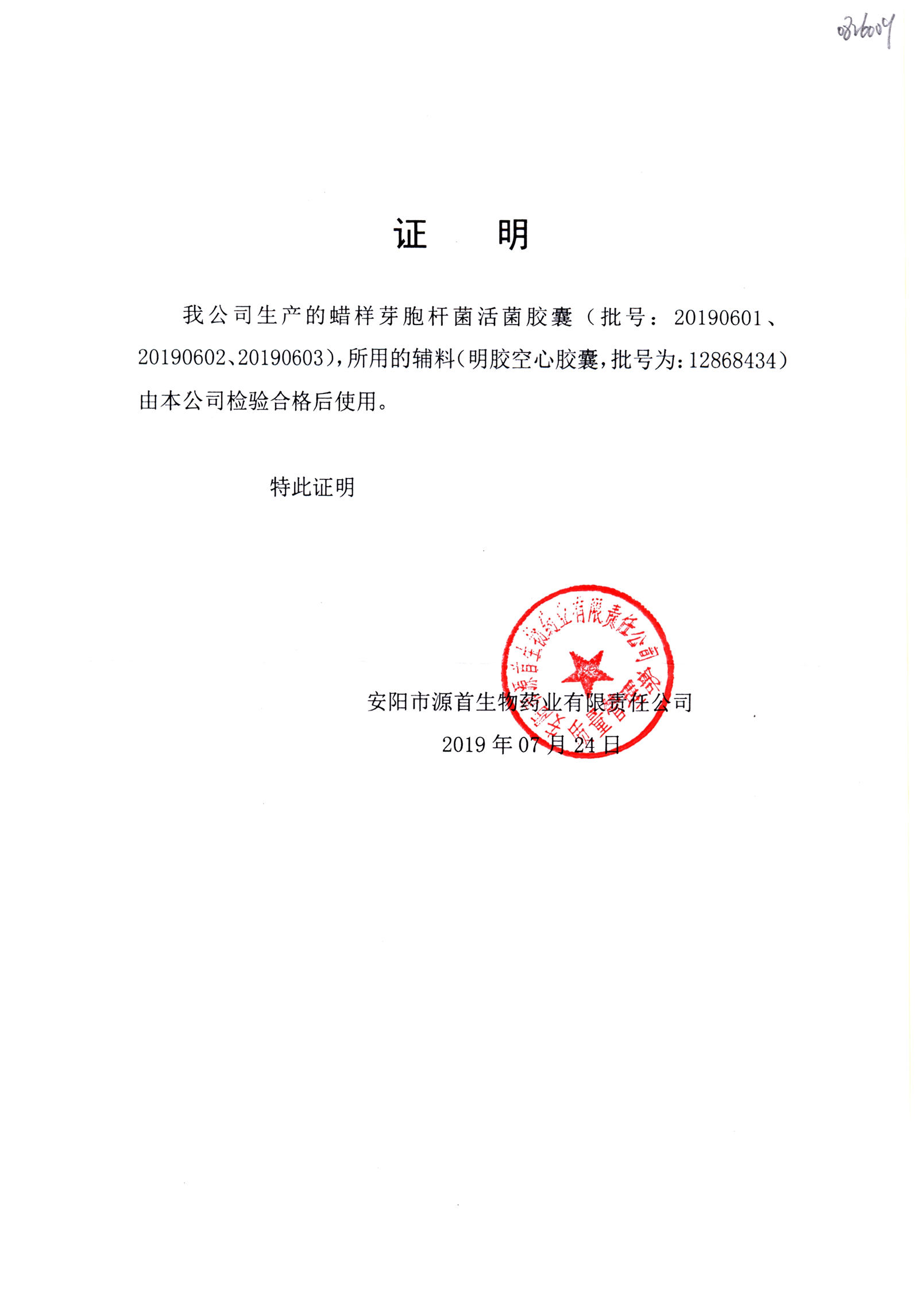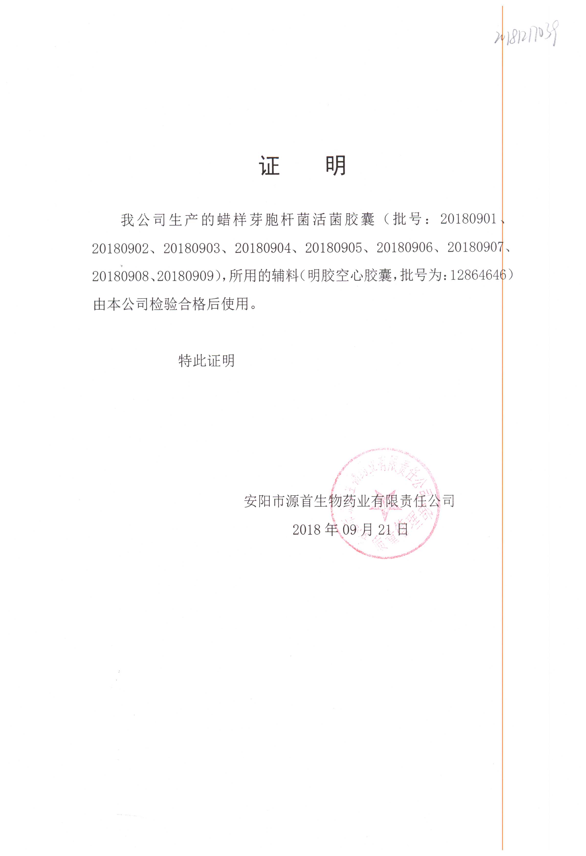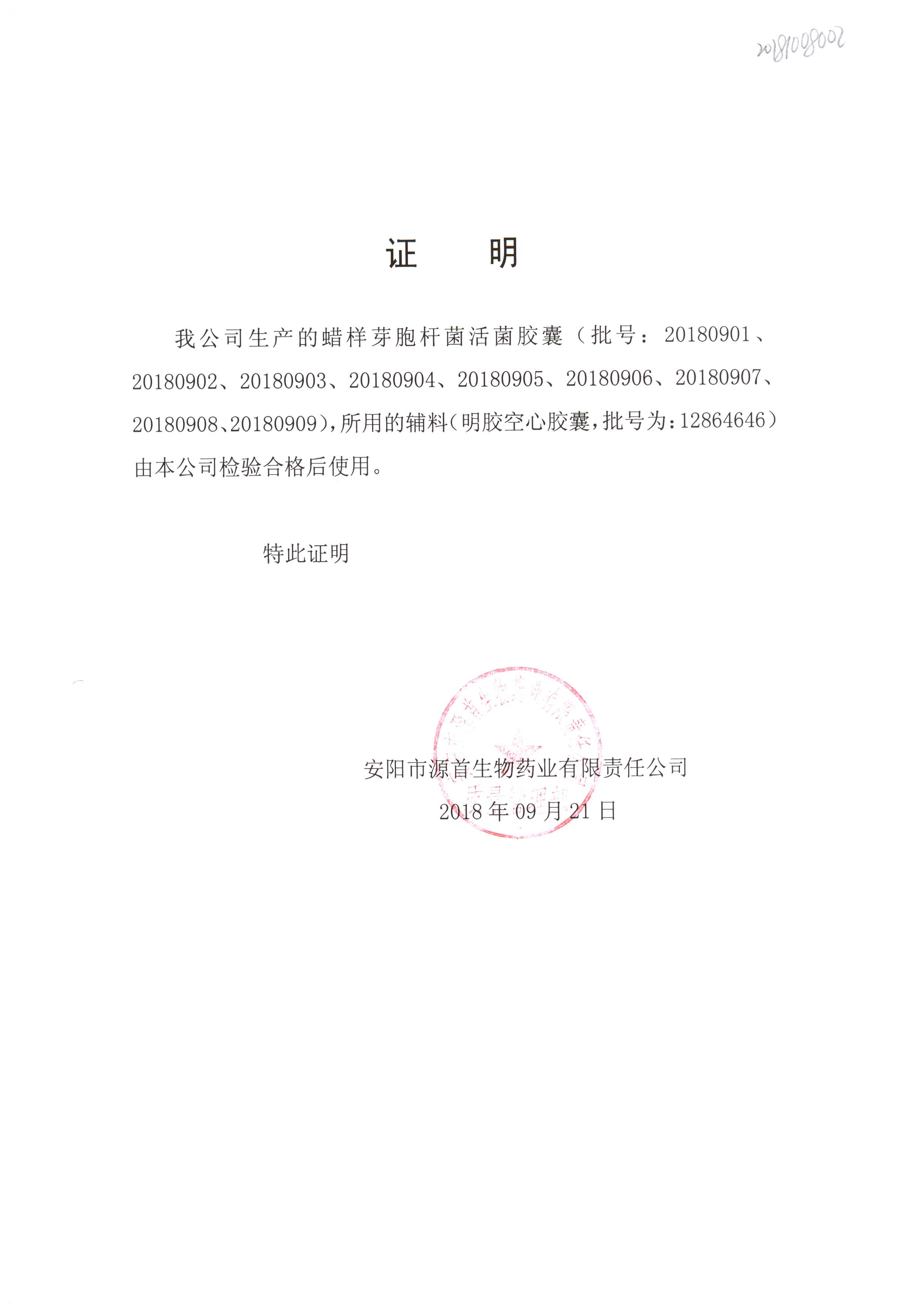 蠟樣芽孢桿菌活菌膠囊(源首) | 0.25g | 20180504(2/3) | 查看詳情 |
