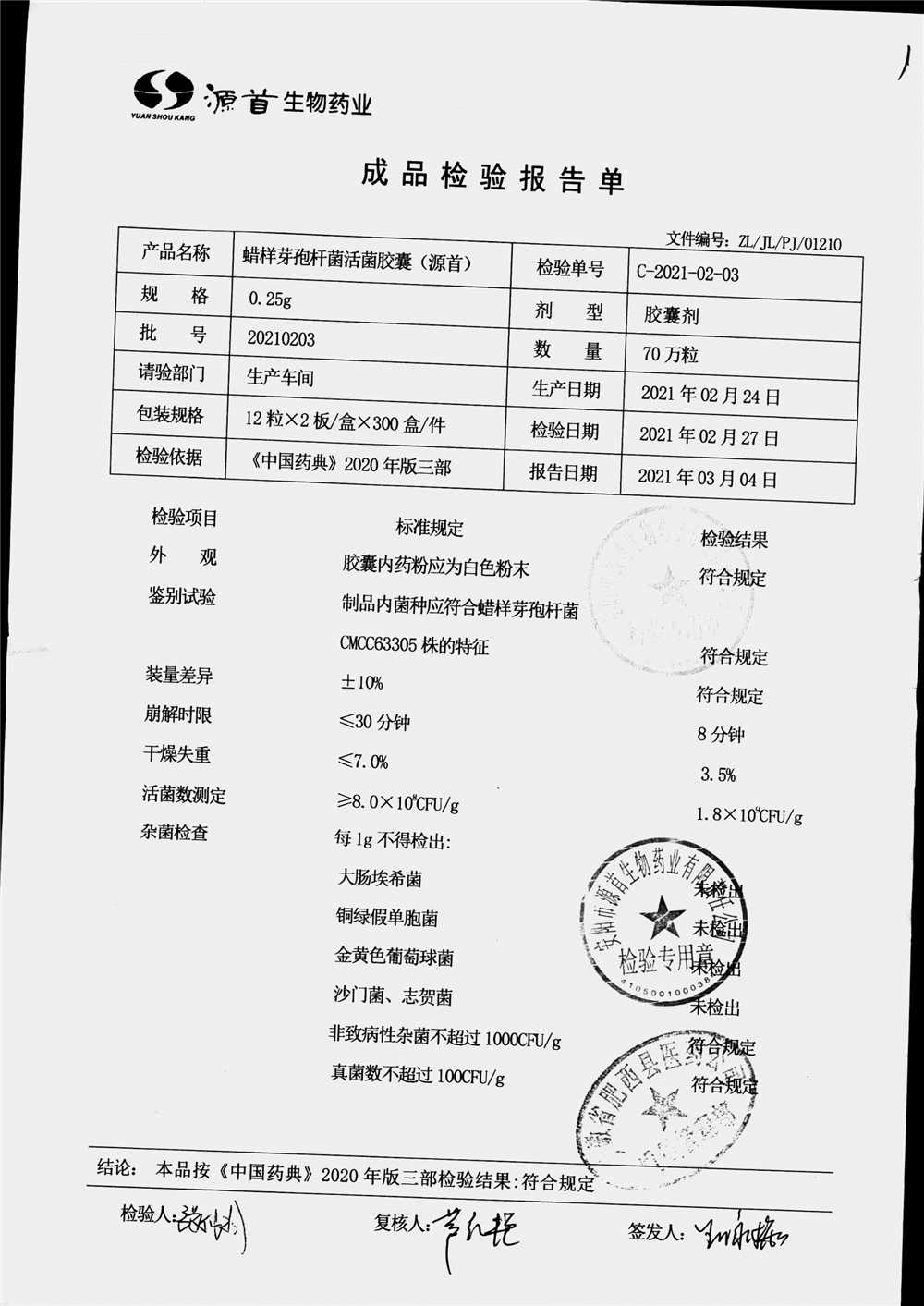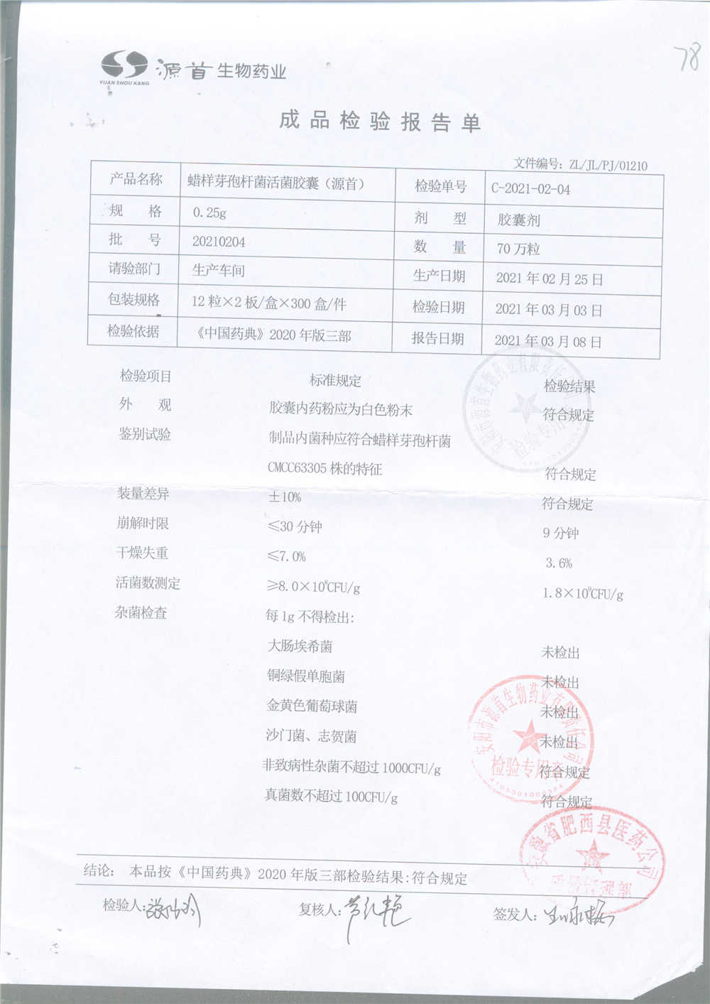蠟樣芽孢桿菌活菌膠囊(源首) | 0.25g | 20200702(2/3) | 查看詳情 |