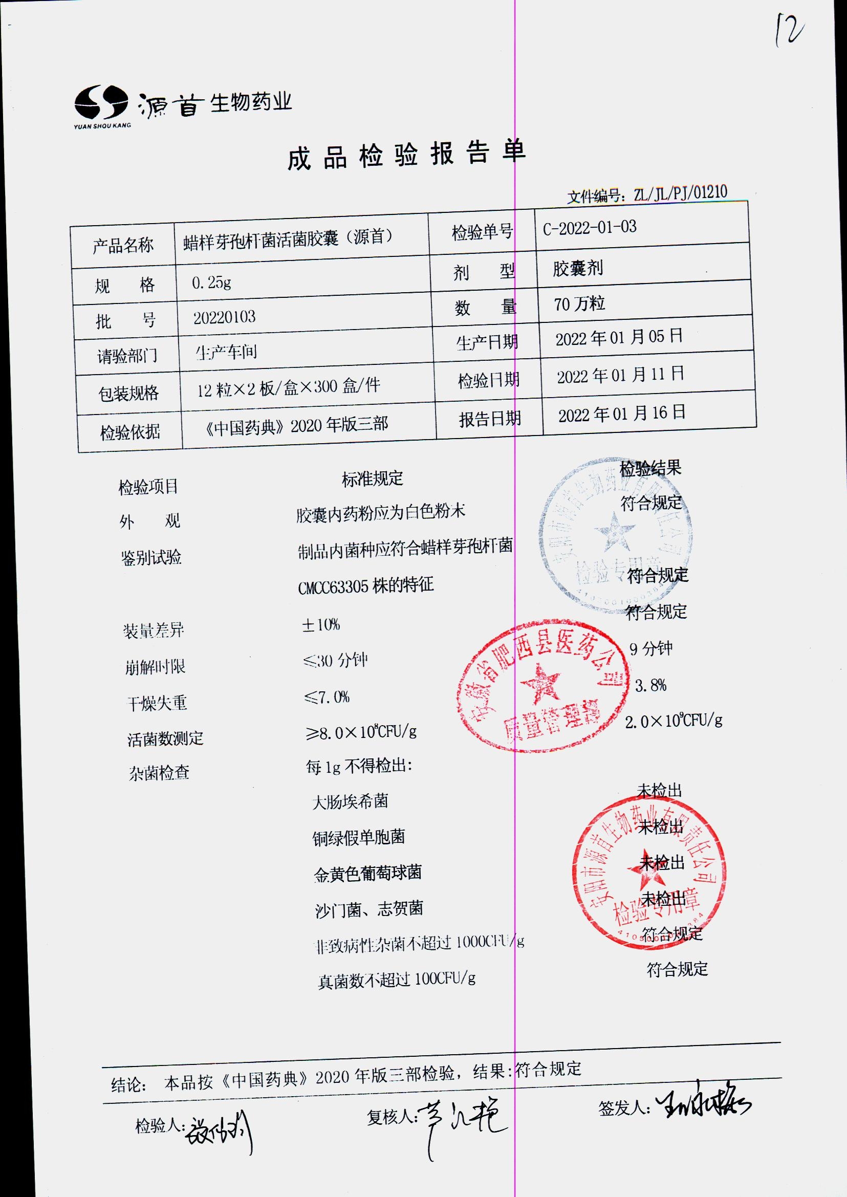蠟樣芽孢桿菌活菌膠囊(源首) | 0.25g | 20220103 | 查看詳情 |