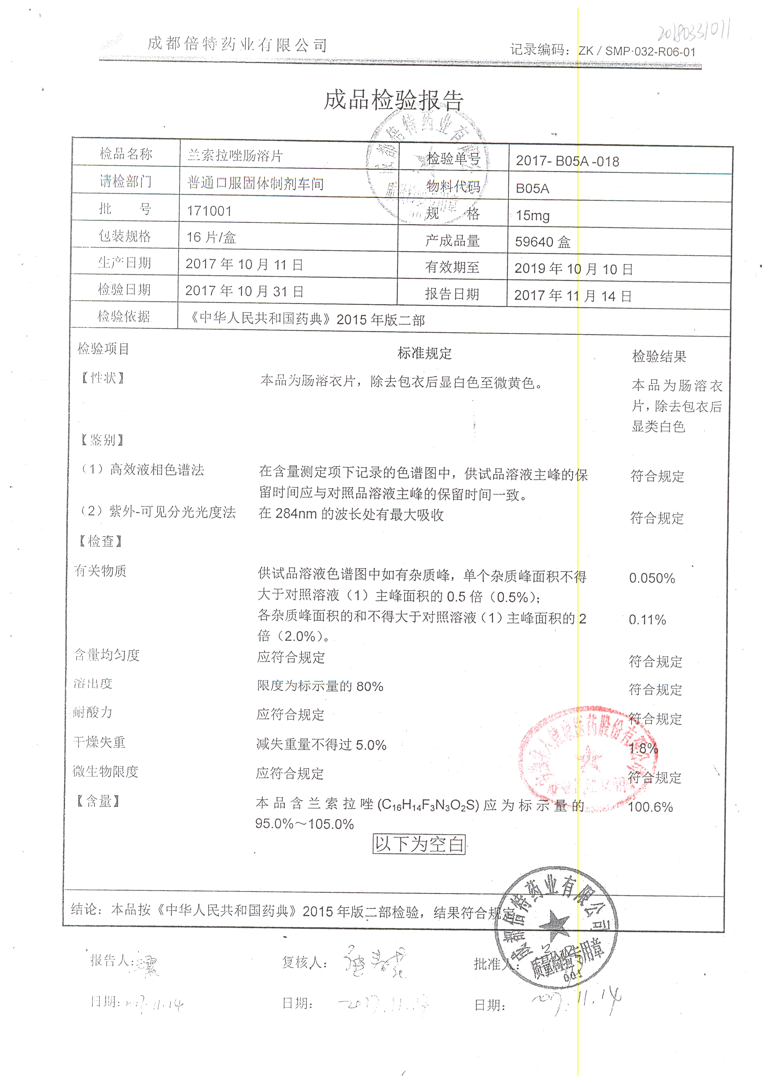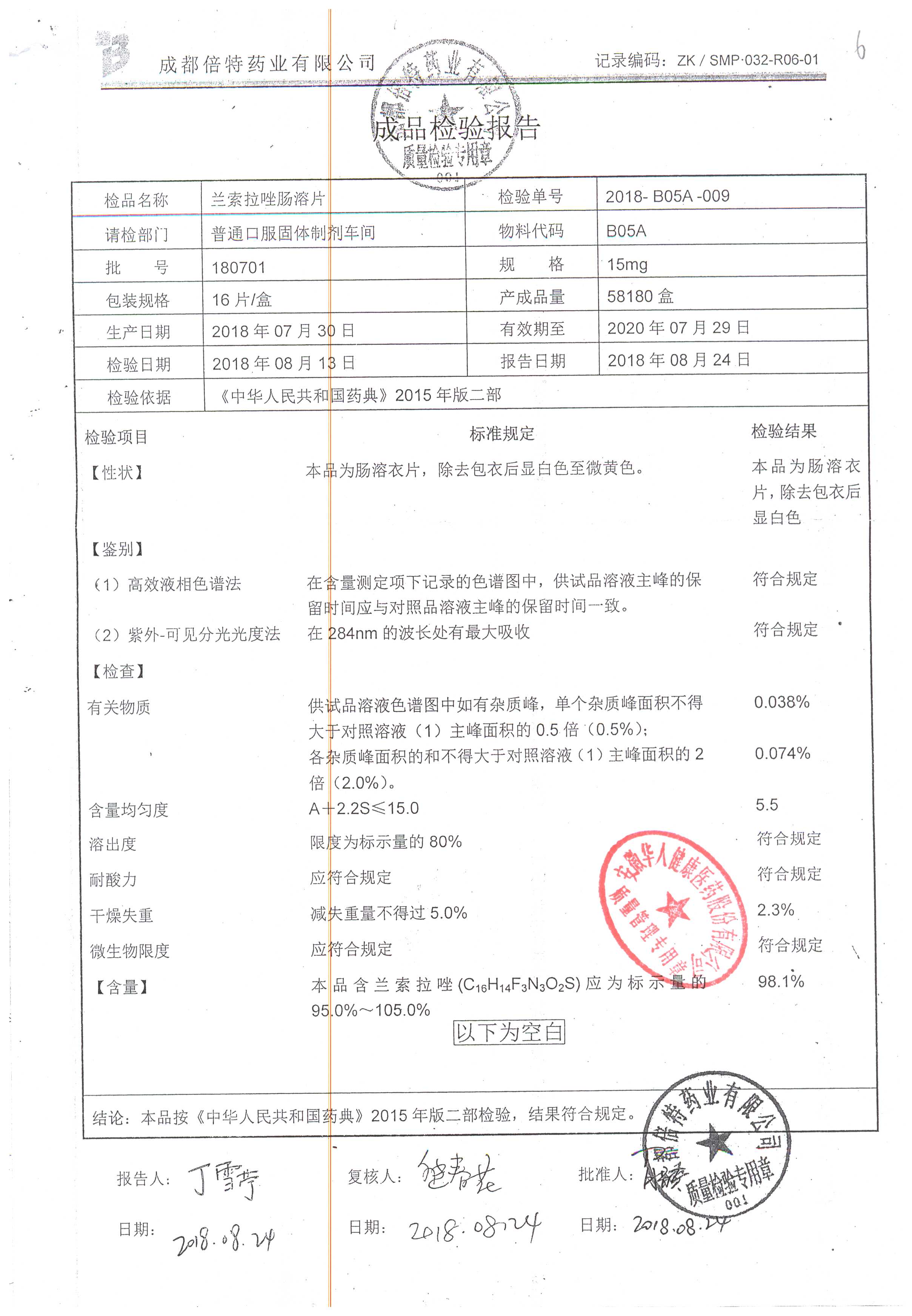 名稱 | 規(guī)格 | 批號 | 藥檢報告 |