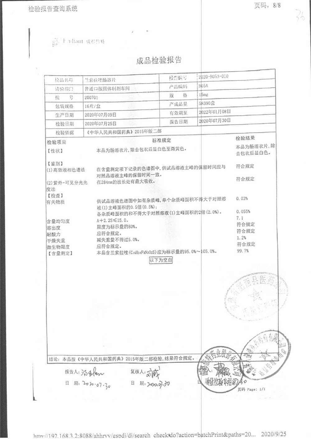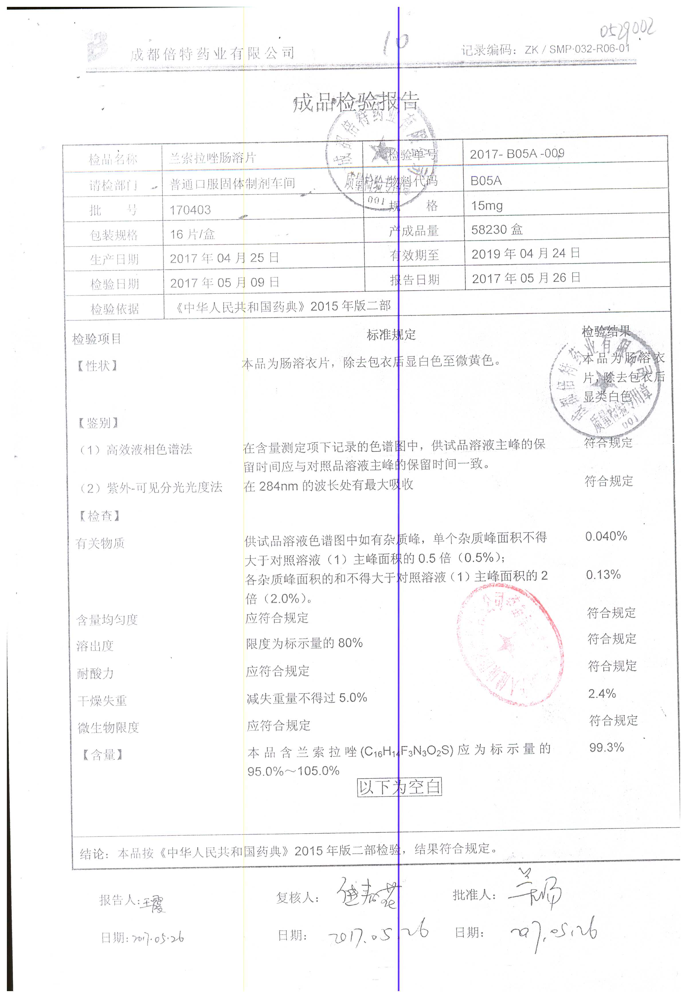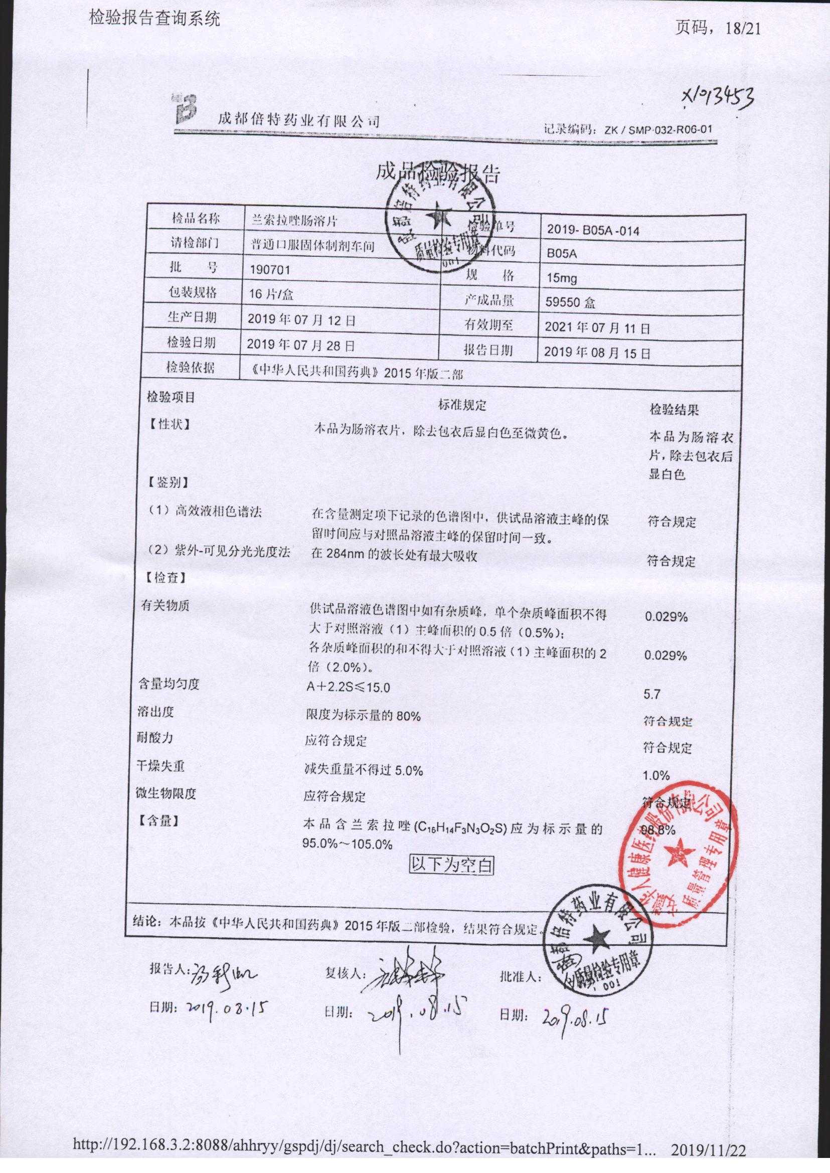 蘭索拉唑腸溶片 | 15mg*16s | 190701 | 查看詳情 |