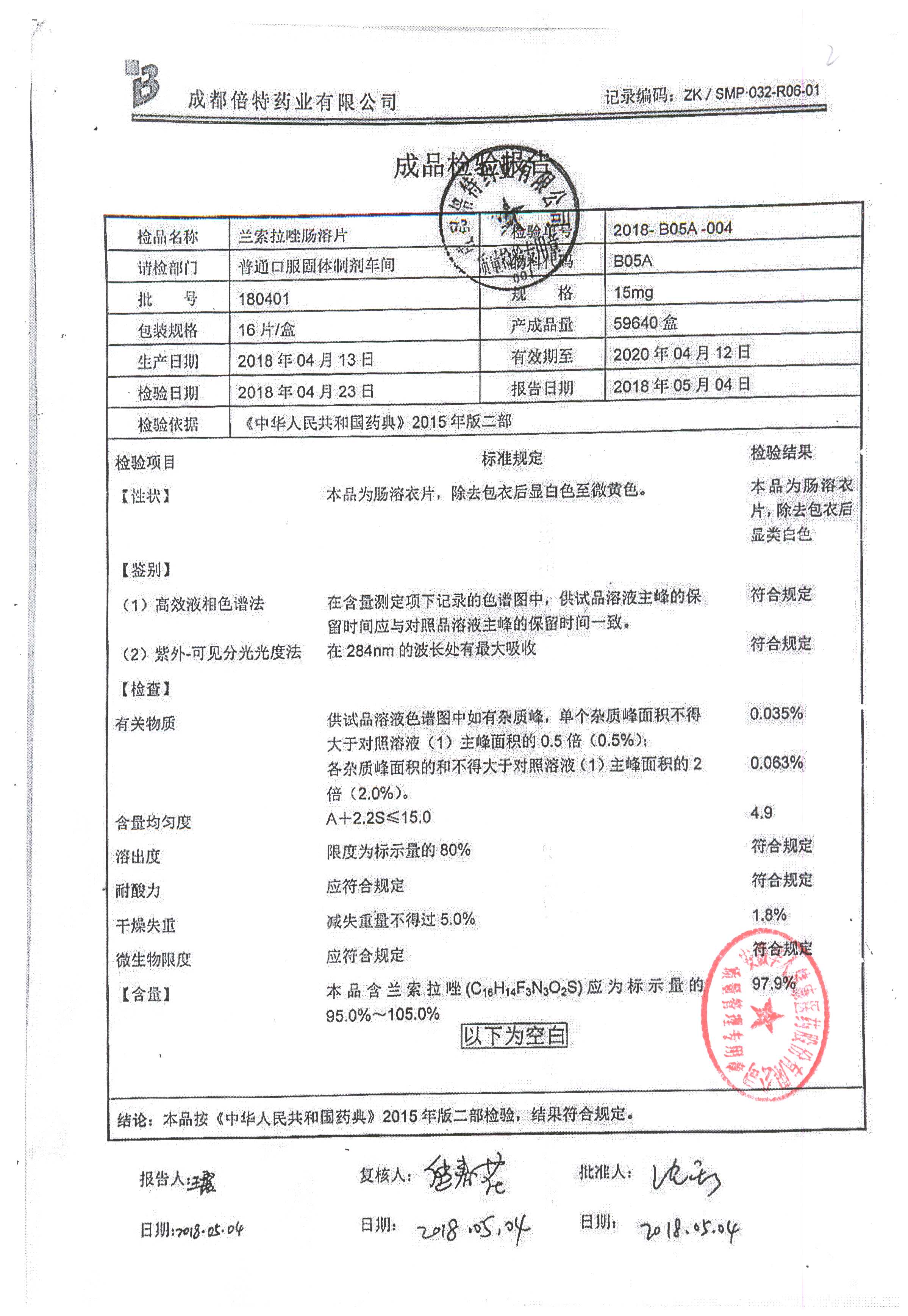 蘭索拉唑腸溶片 | 15mg*16s | 180401 | 查看詳情 |