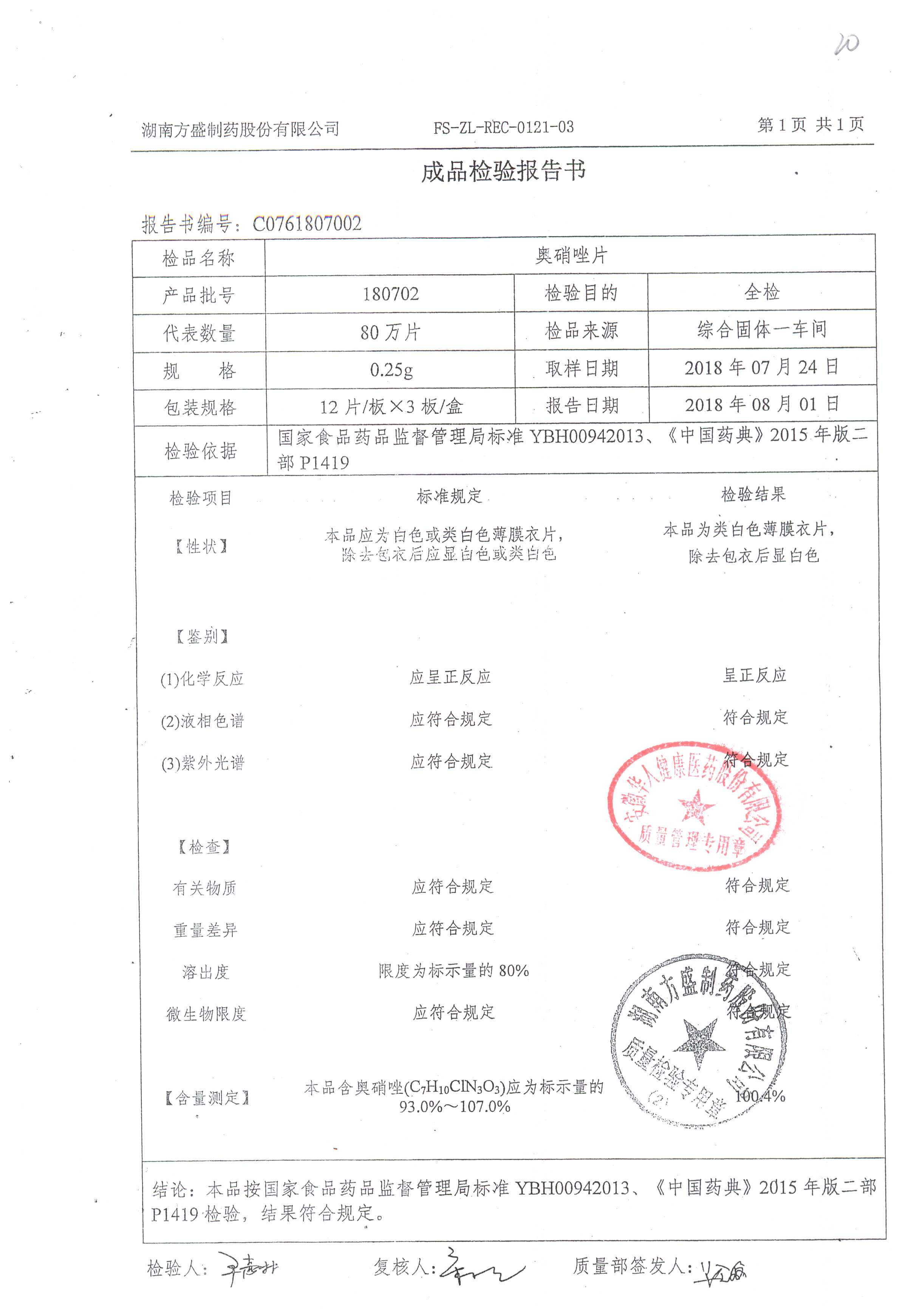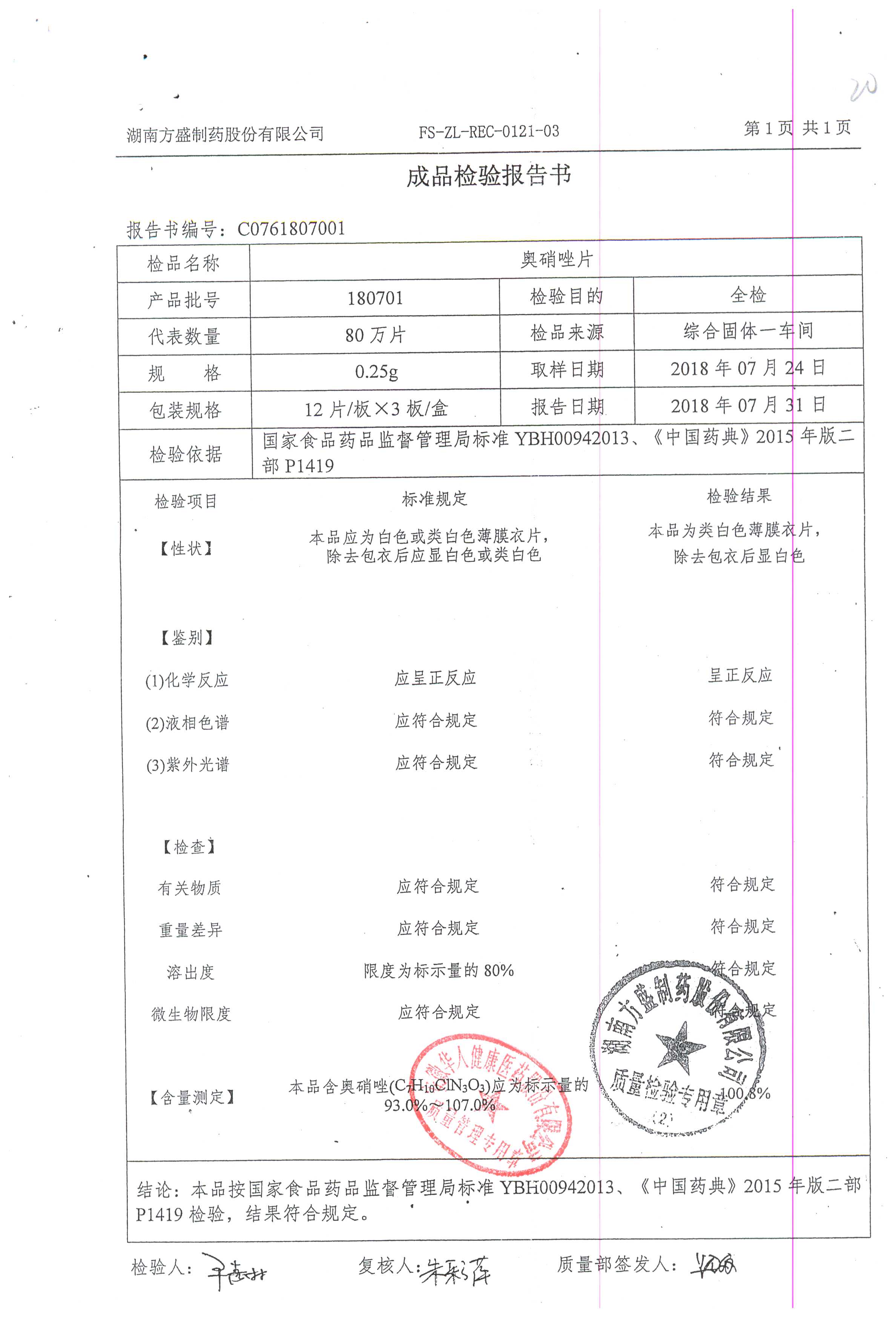 奧硝唑片 | 0.25g-36s | 180701 | 查看詳情 |