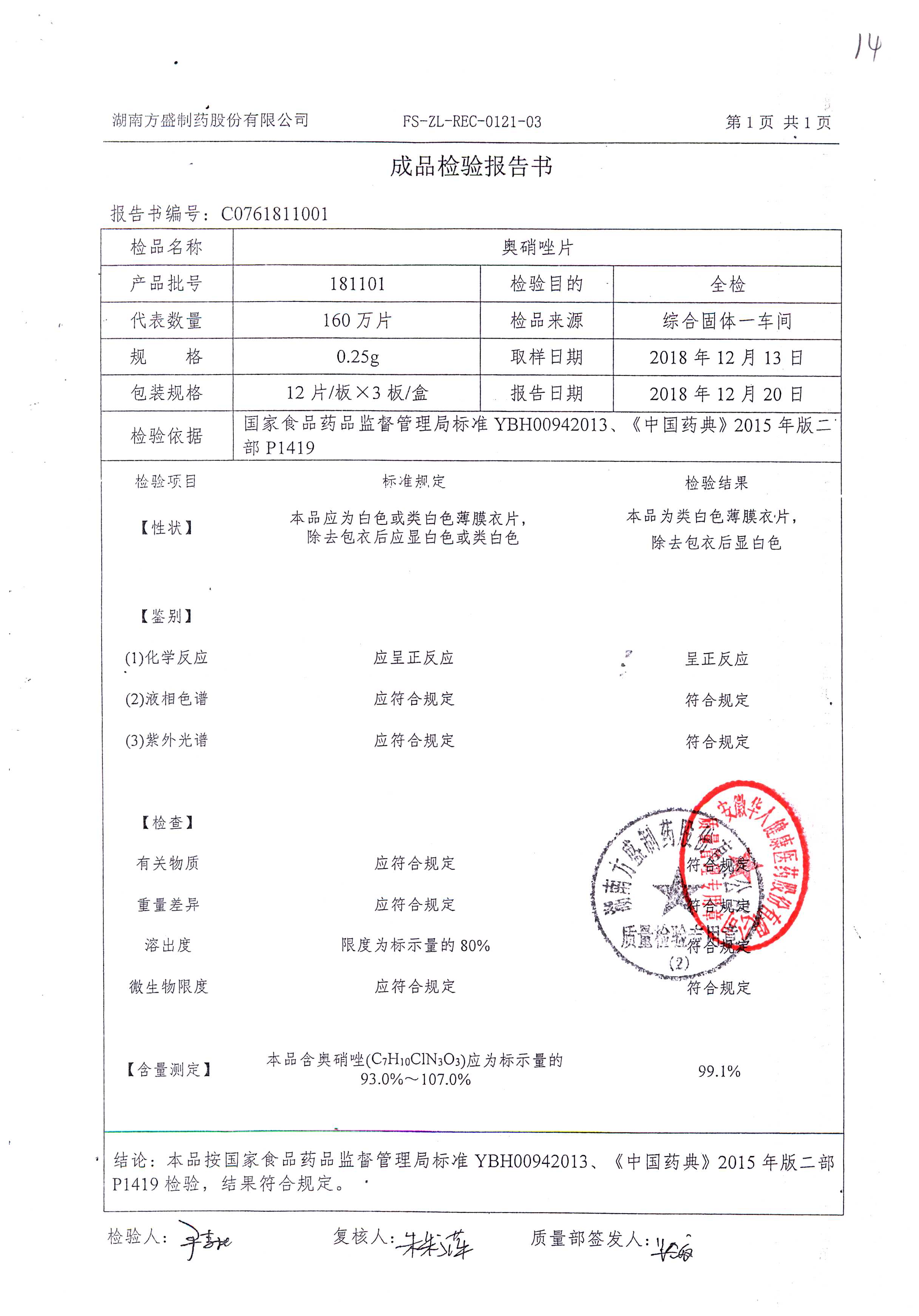 奧硝唑片 | 0.25g-36s | 181101 | 查看詳情 |