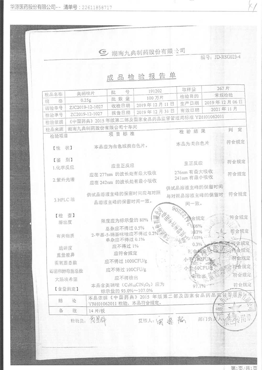奧硝唑片 | 0.25g-36s | 191202 | 查看詳情 |
