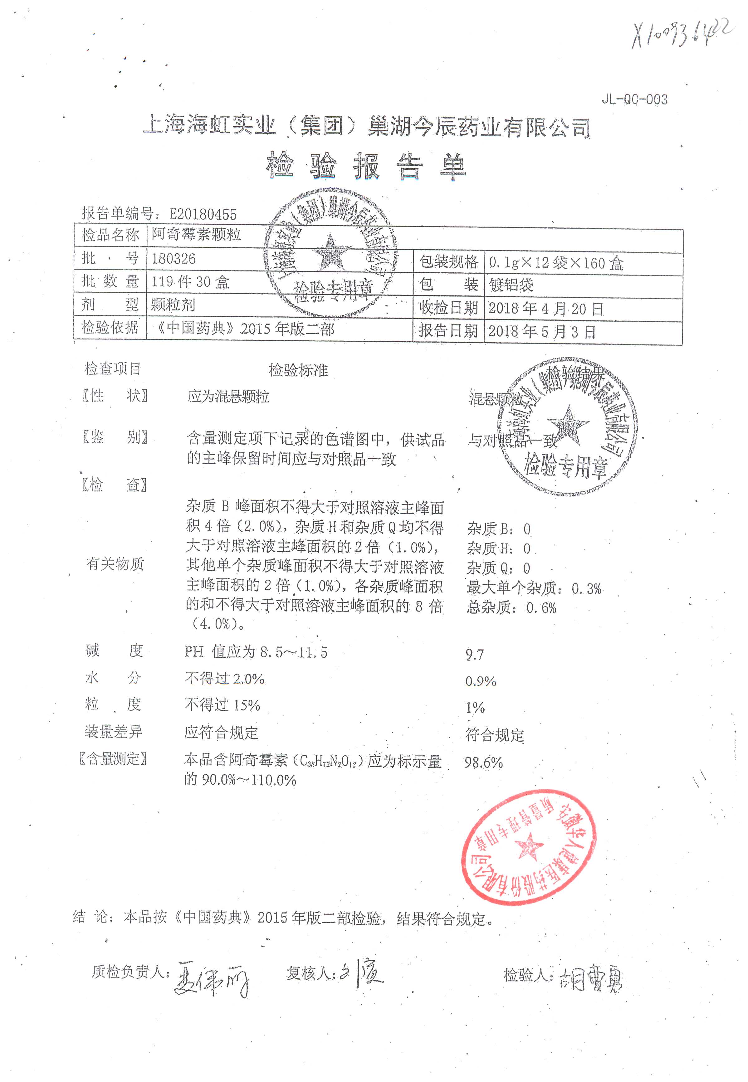 阿奇霉素顆粒 0.1g-12袋 180507 查看詳情
