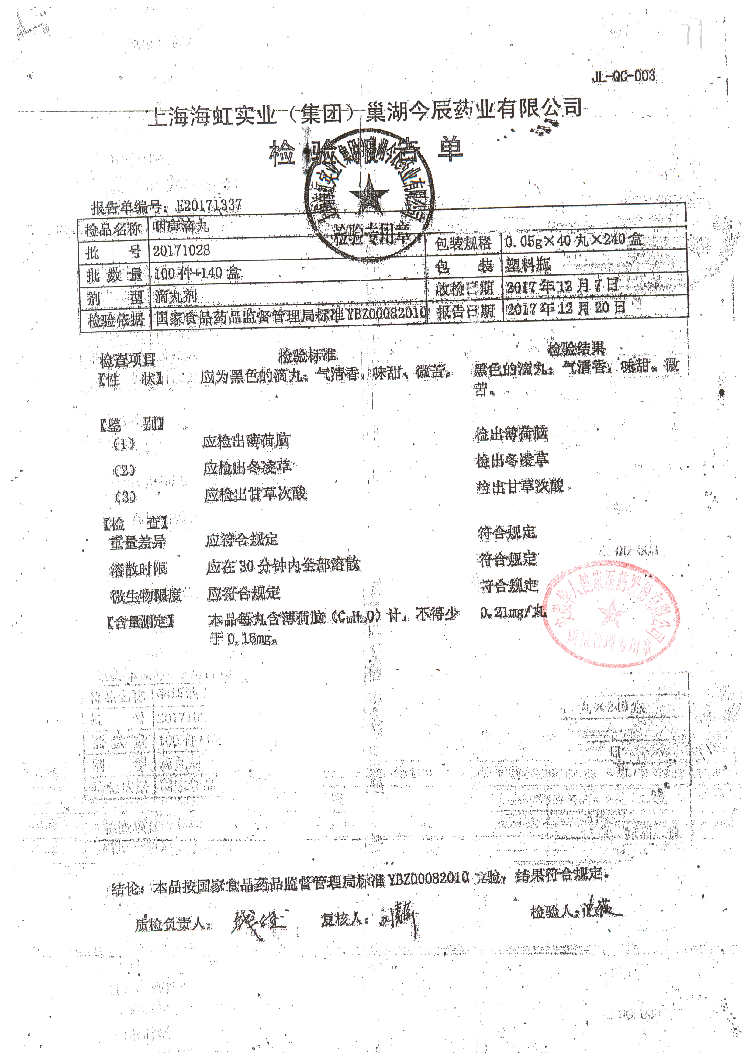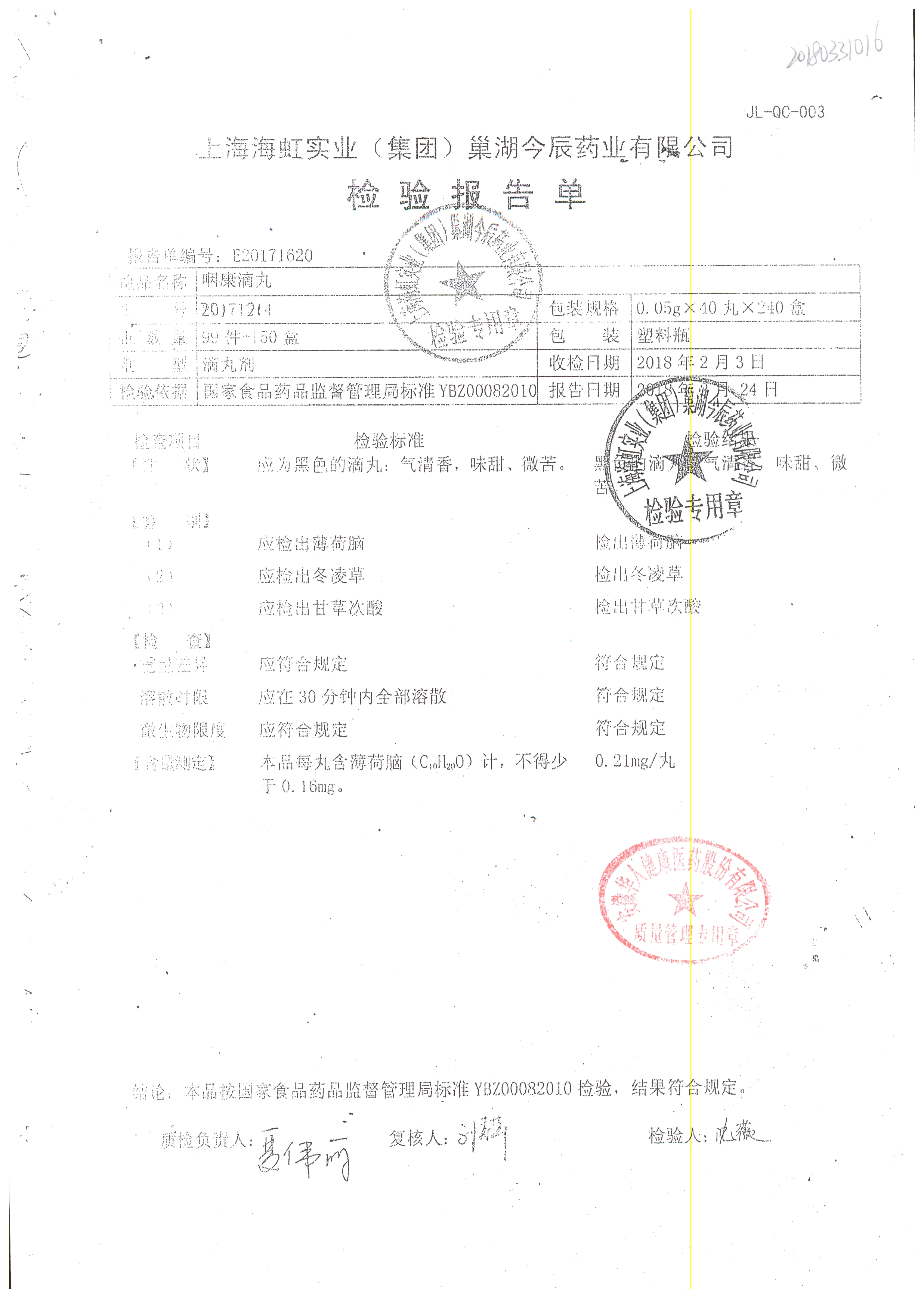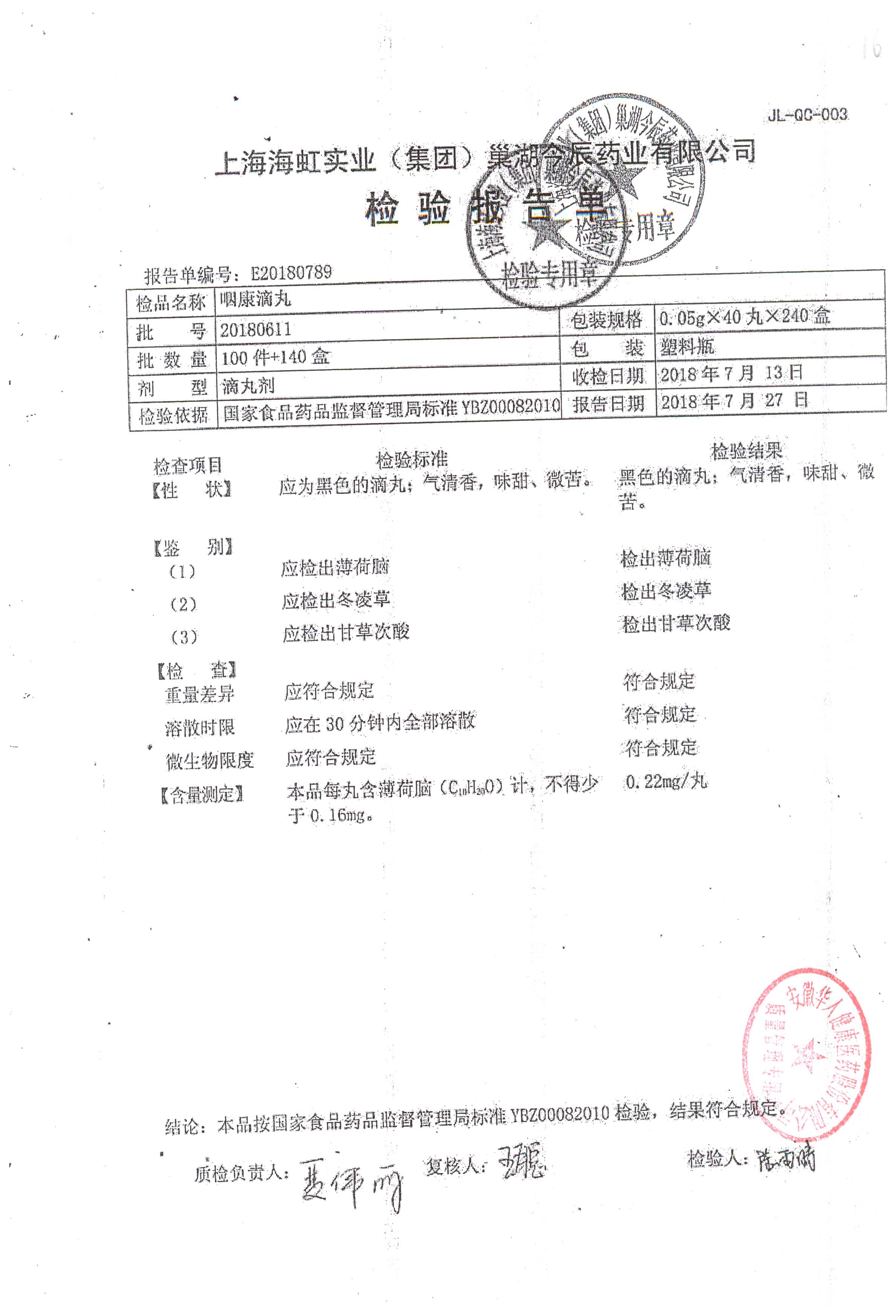 咽康滴丸 | 0.05g*40丸 | 20171217 | 查看詳情 |