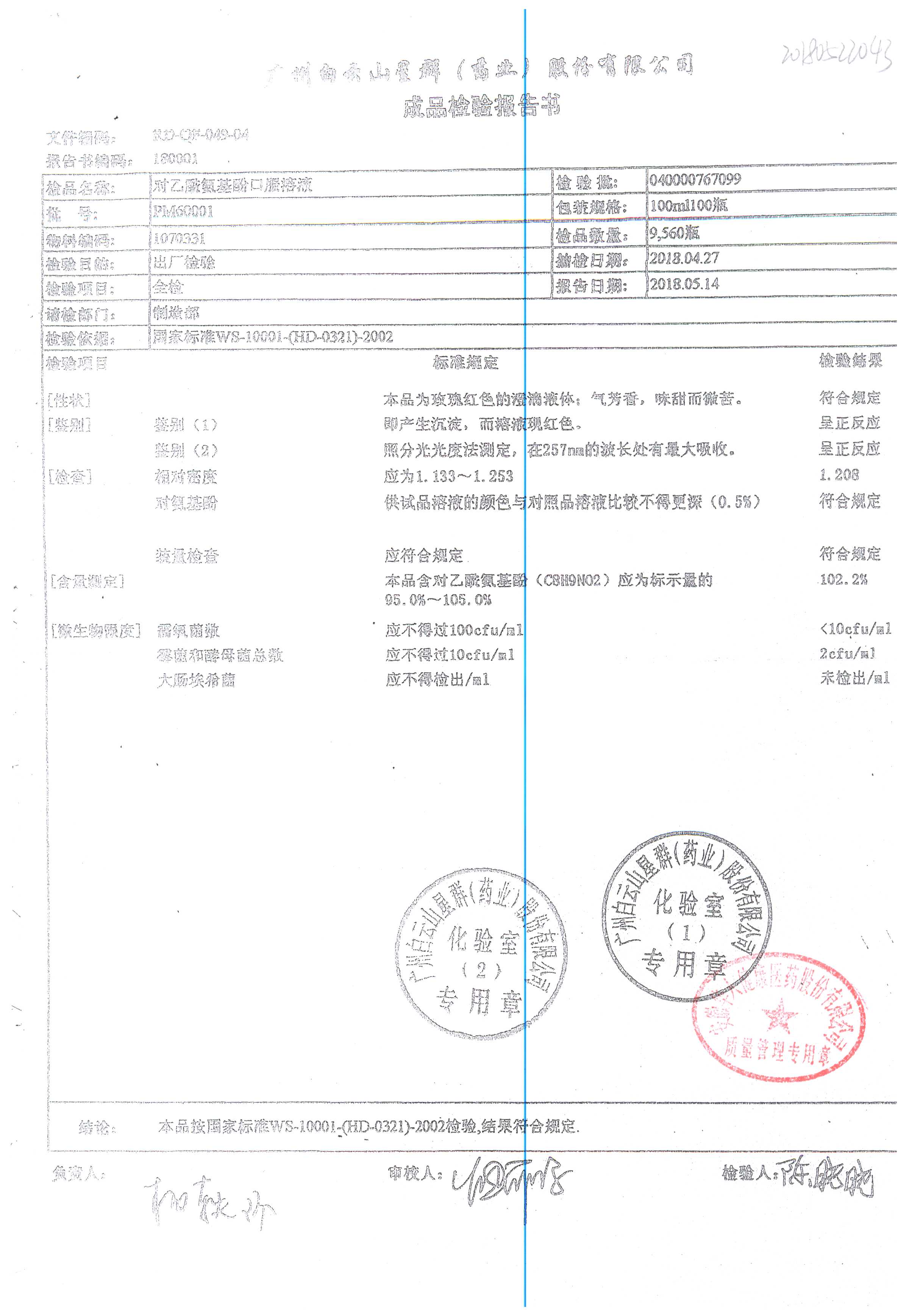 對(duì)乙醯氨基酚口服溶液 100ml PM60001 查看詳情