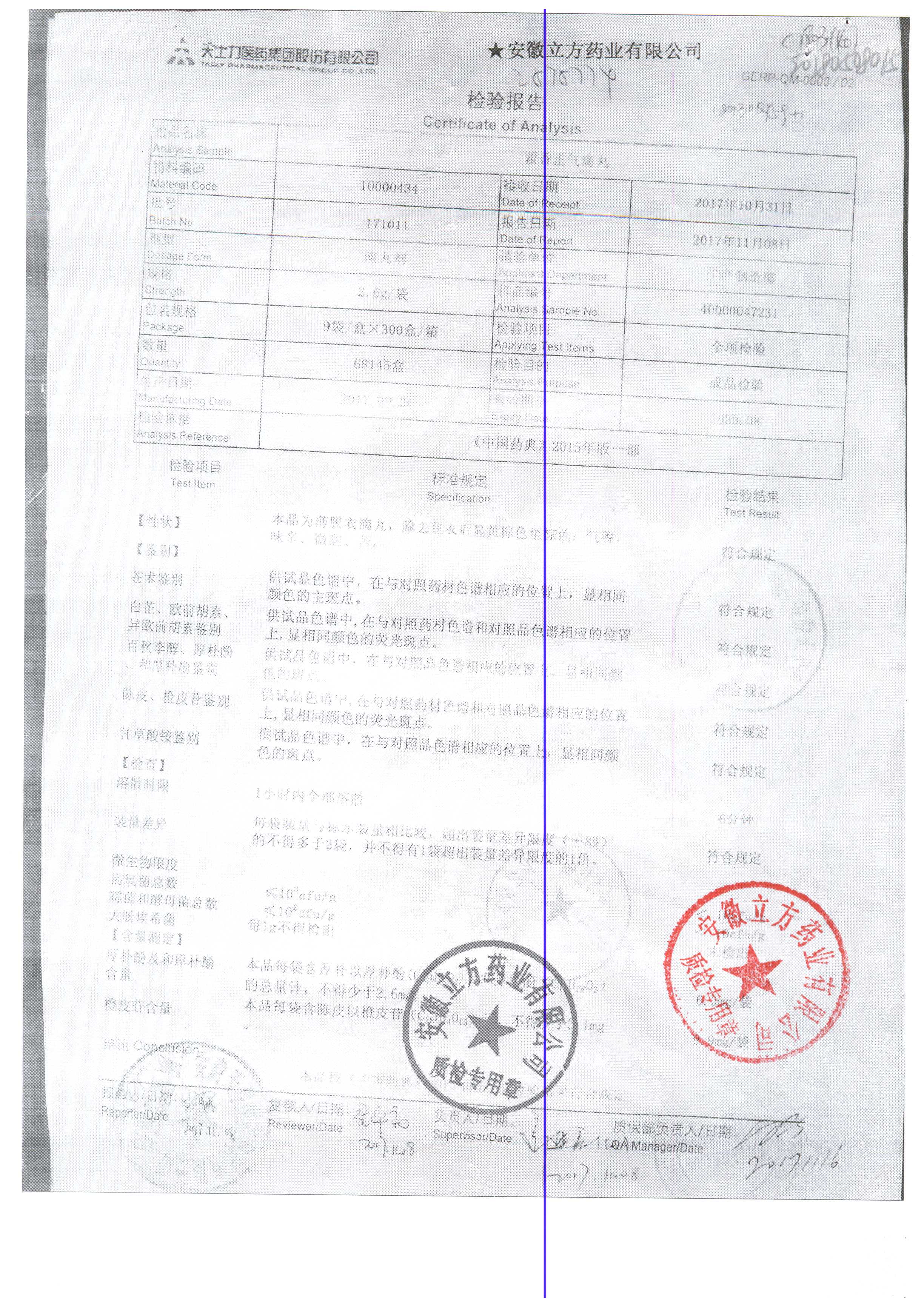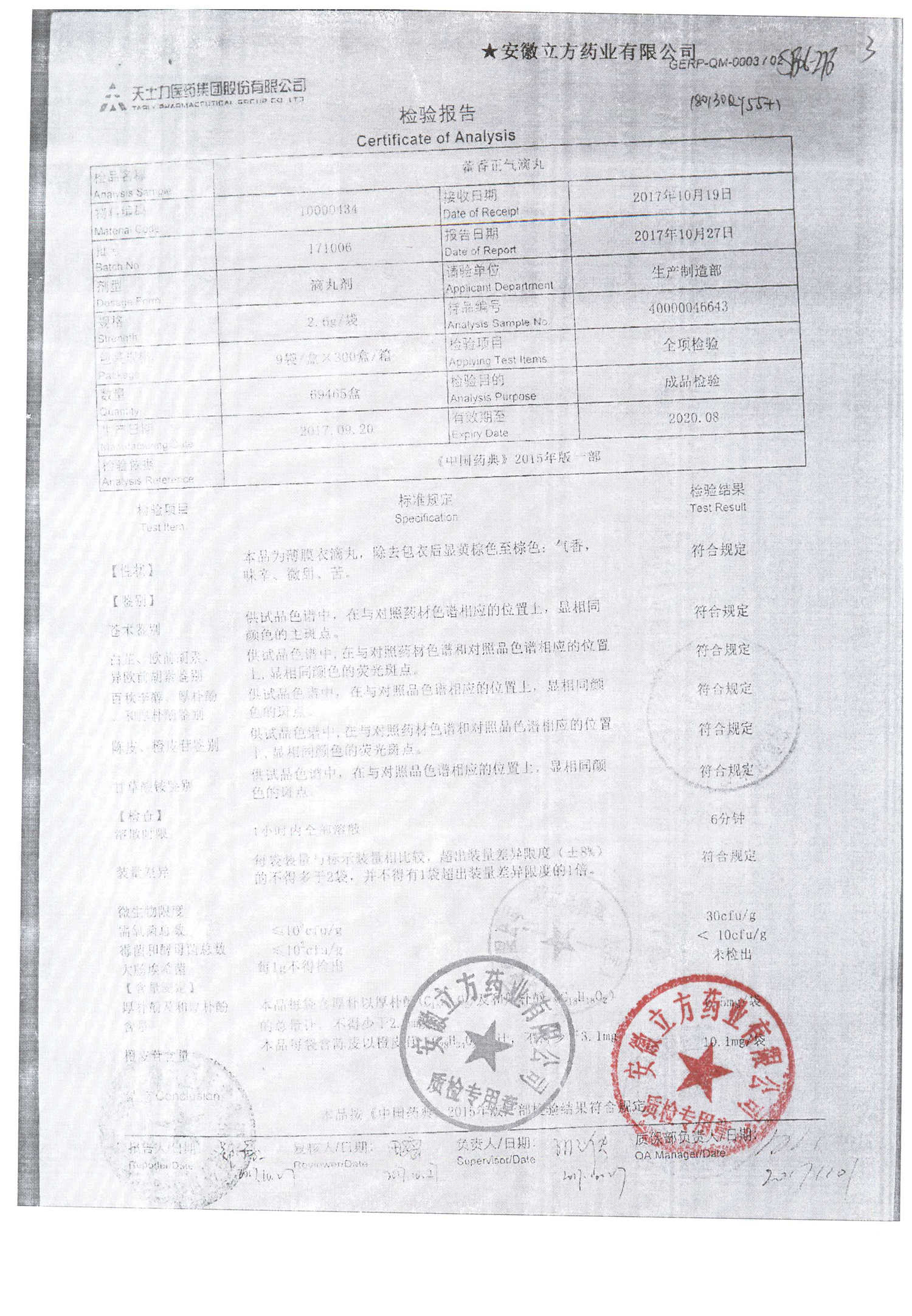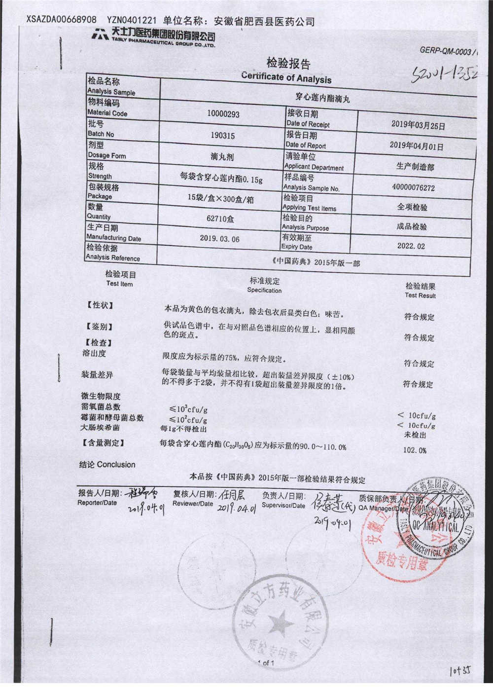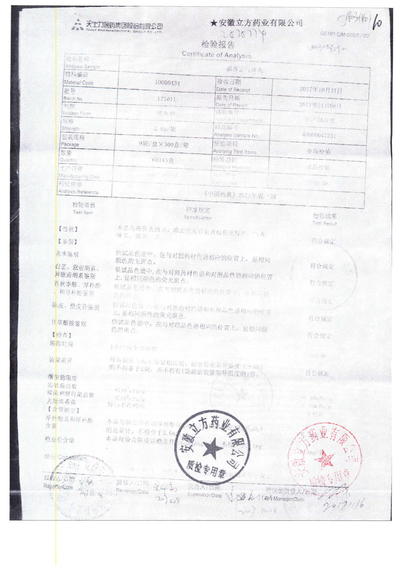 名稱 規(guī)格 批號(hào) 藥檢報(bào)告
