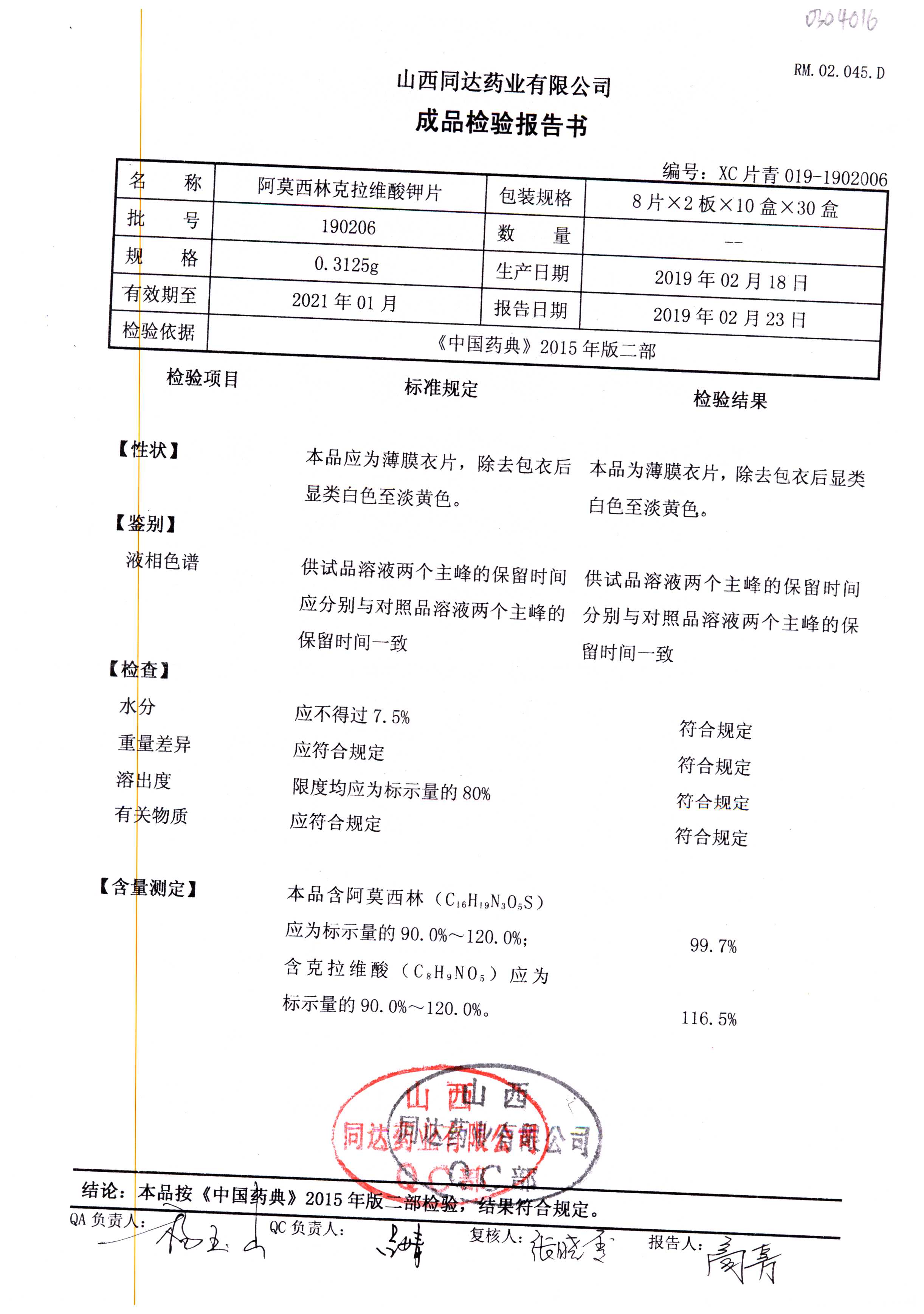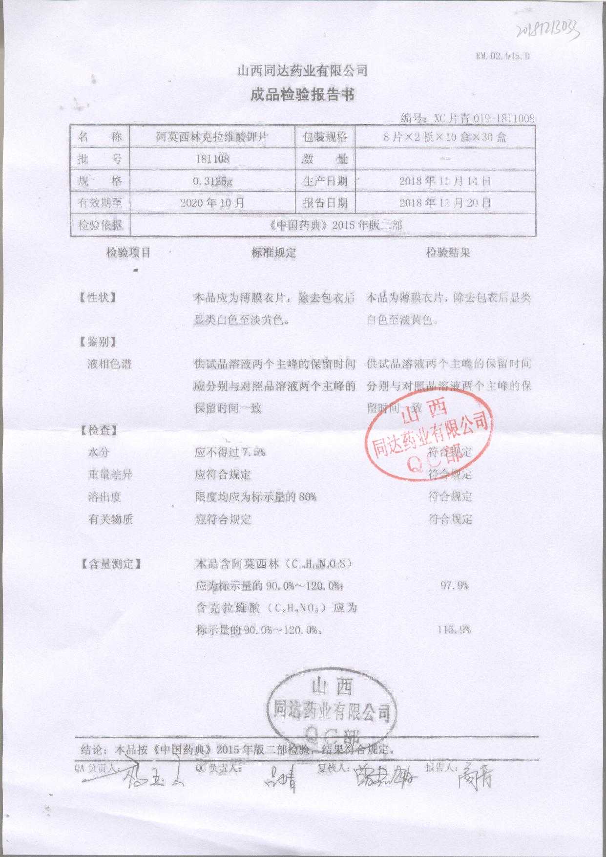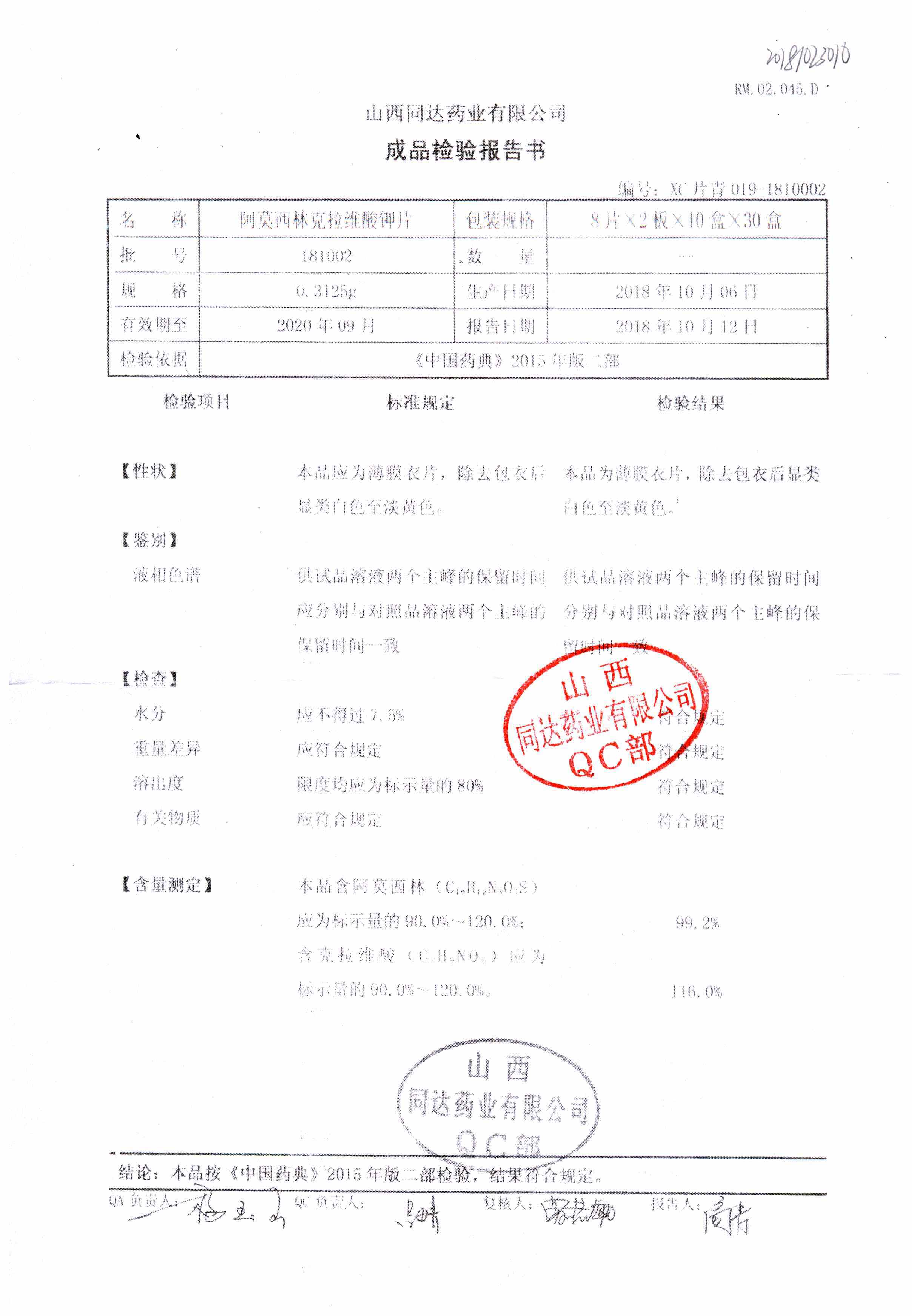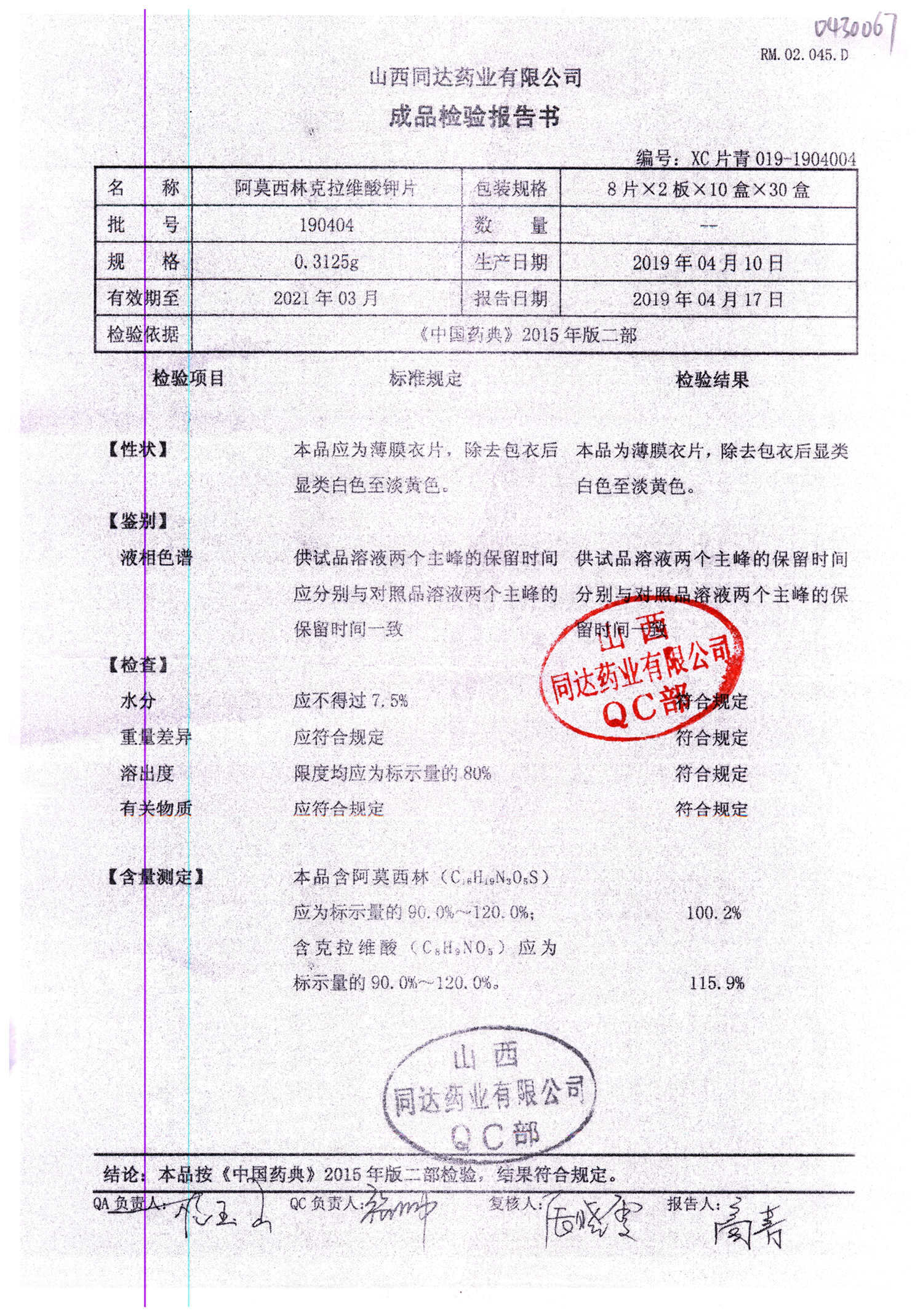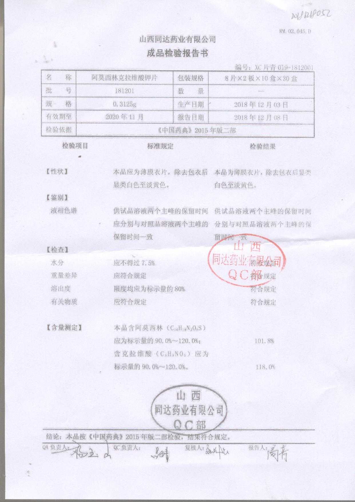 | 阿莫西林克拉維酸鉀片 | 0.3125g*16s | 190326 | 查看詳情 |