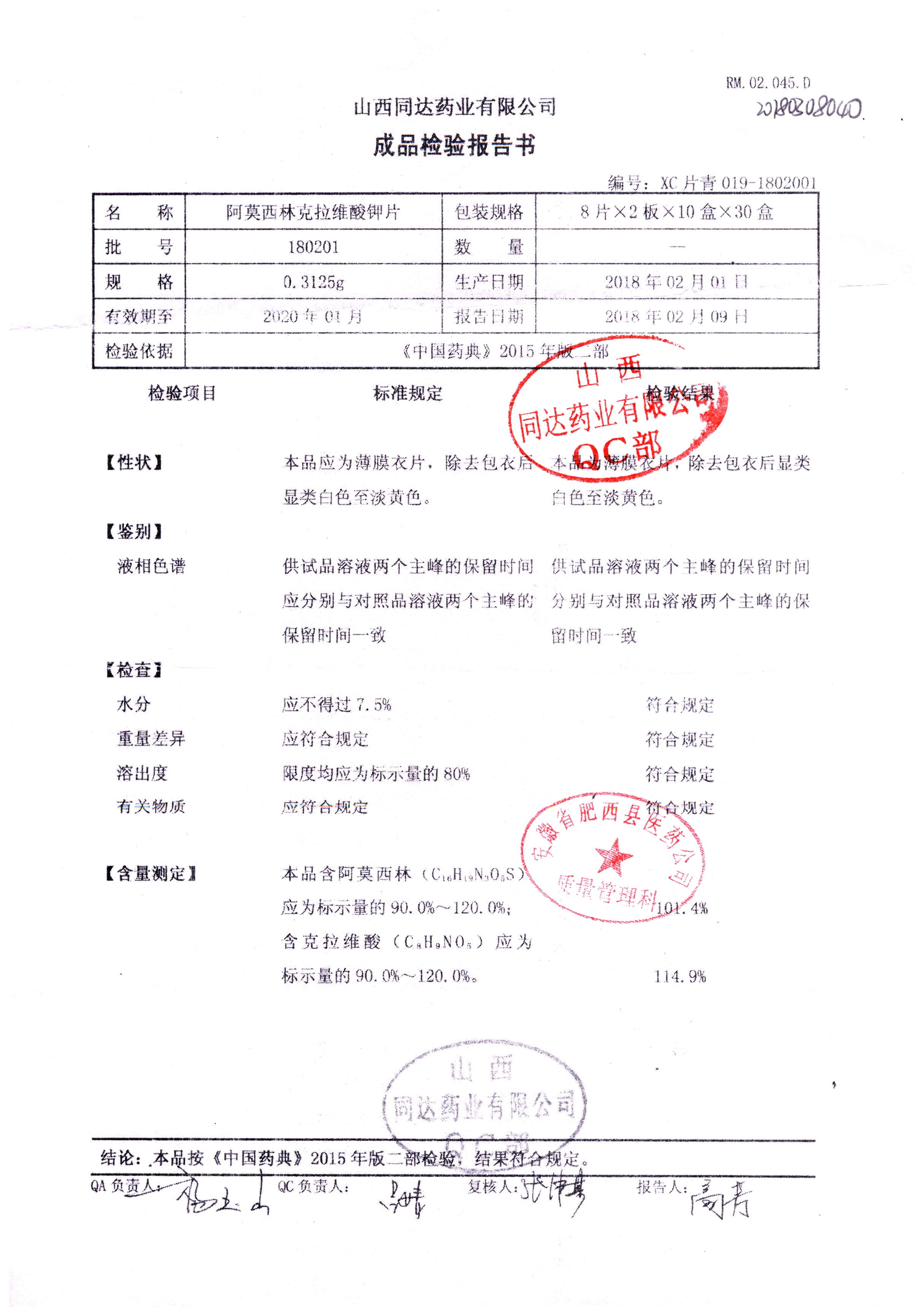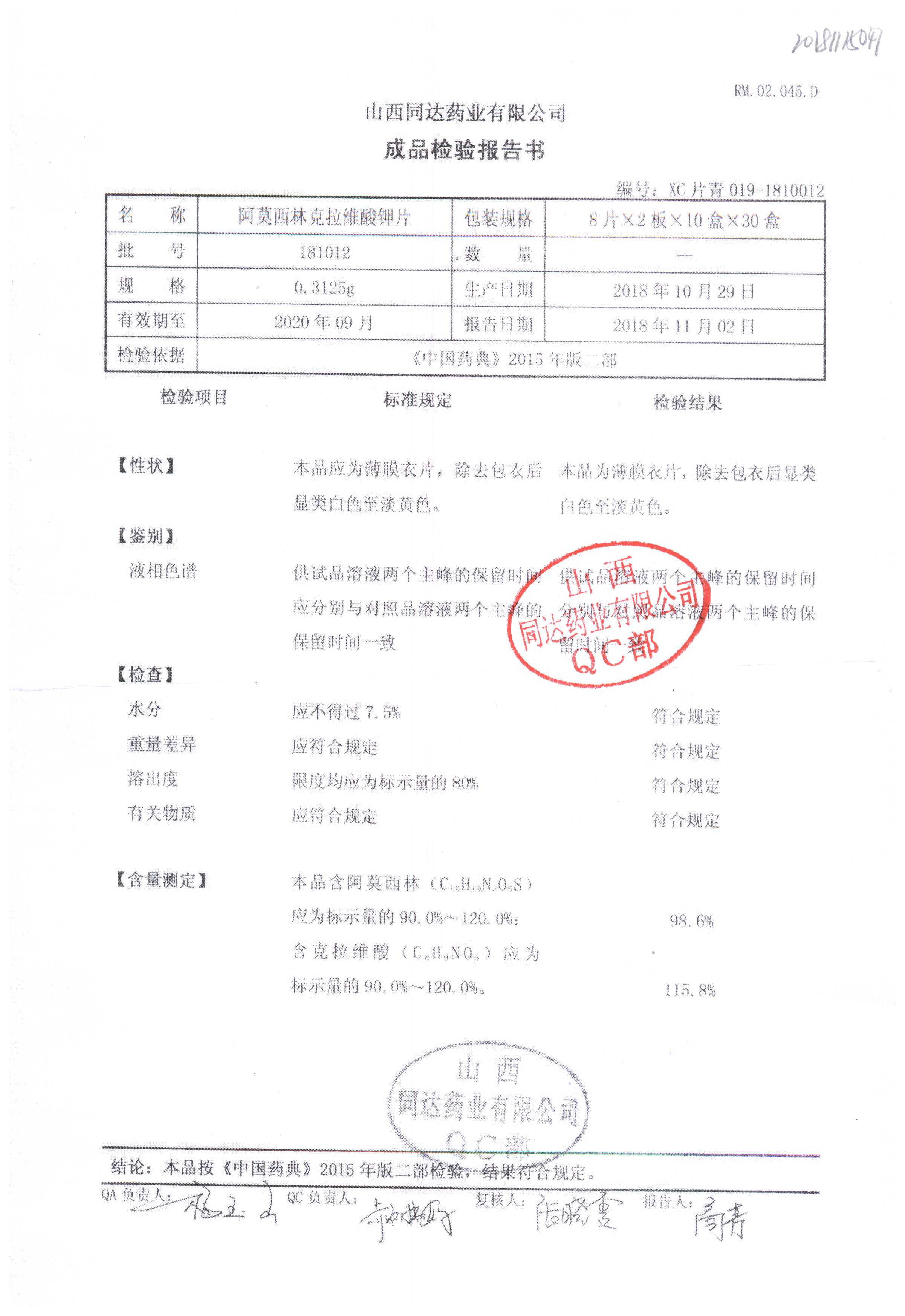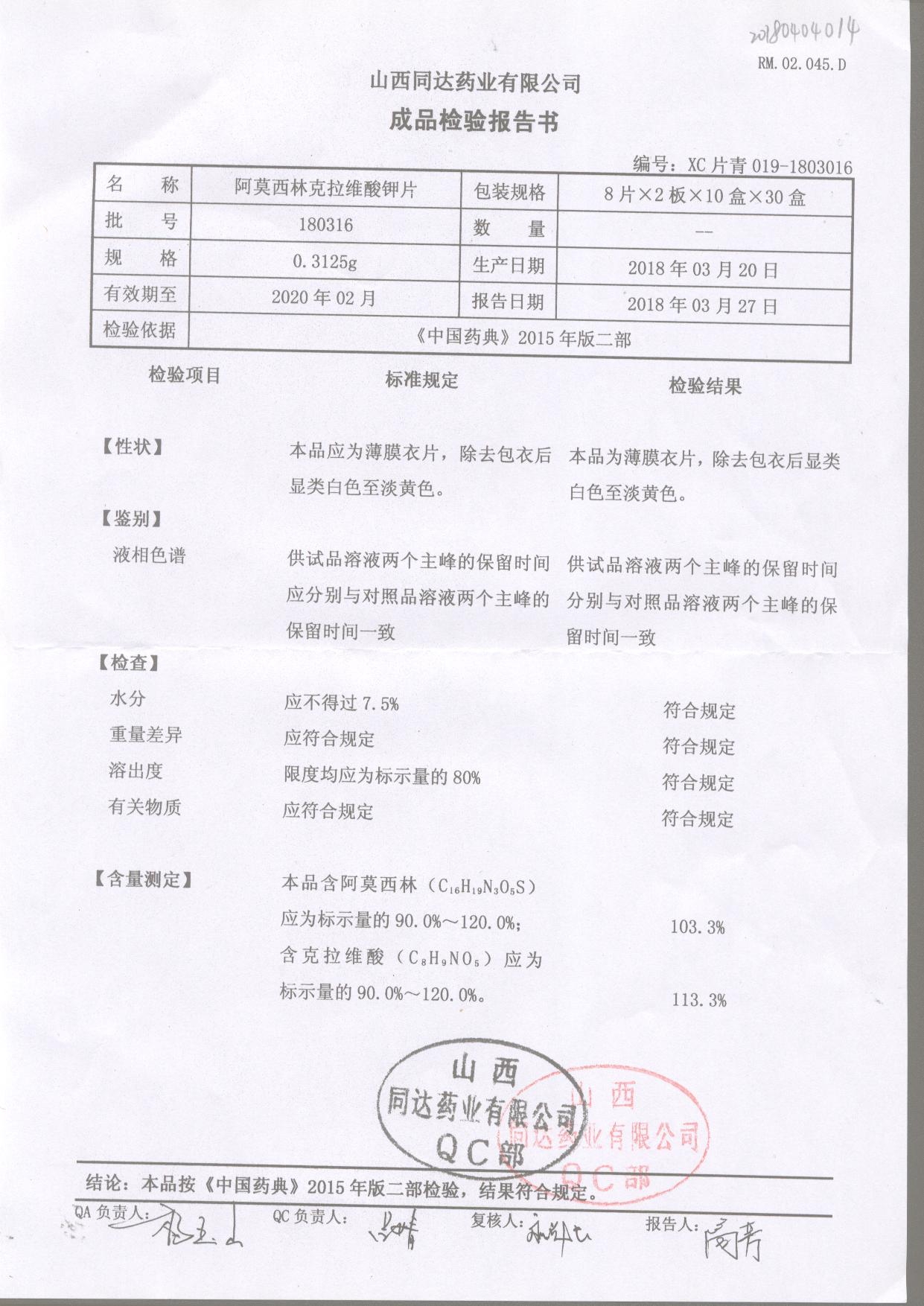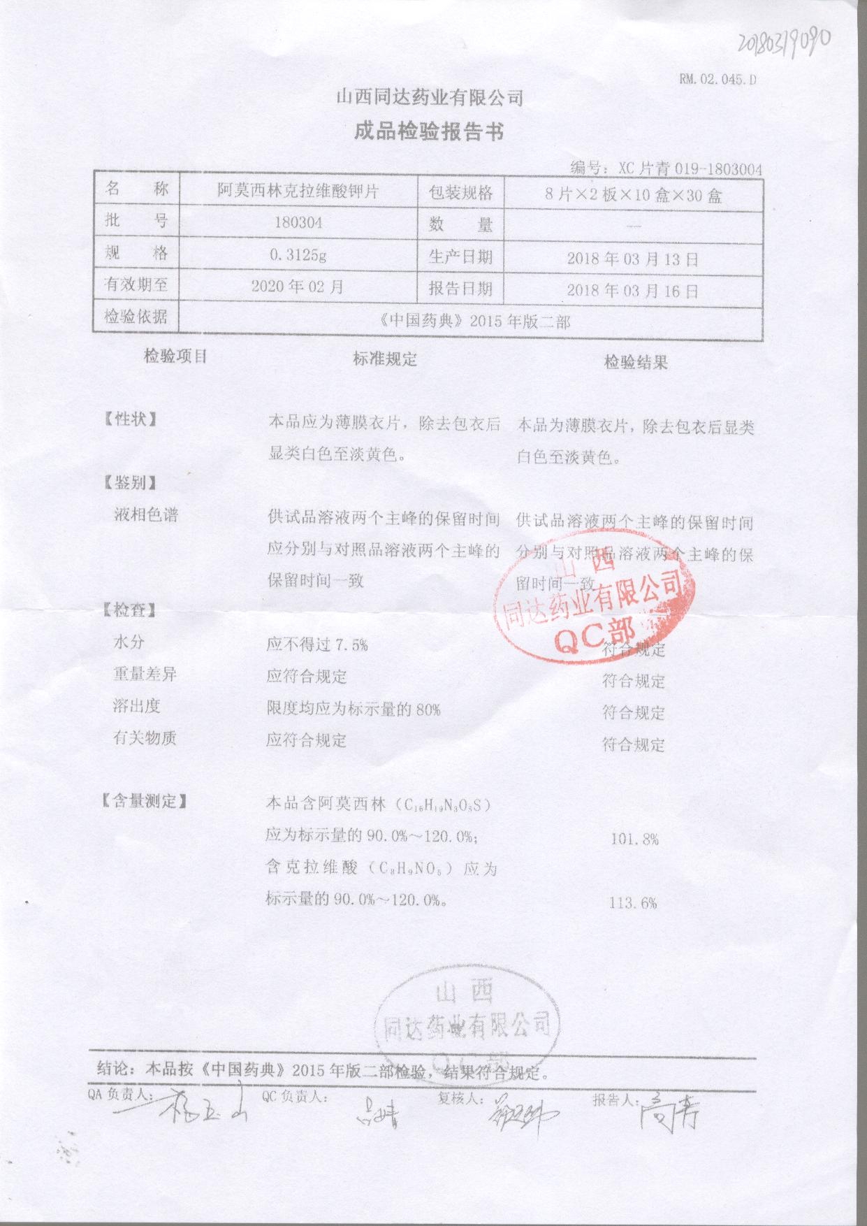 | 阿莫西林克拉維酸鉀片 | 0.3125g*16s | 180403 | 查看詳情 |