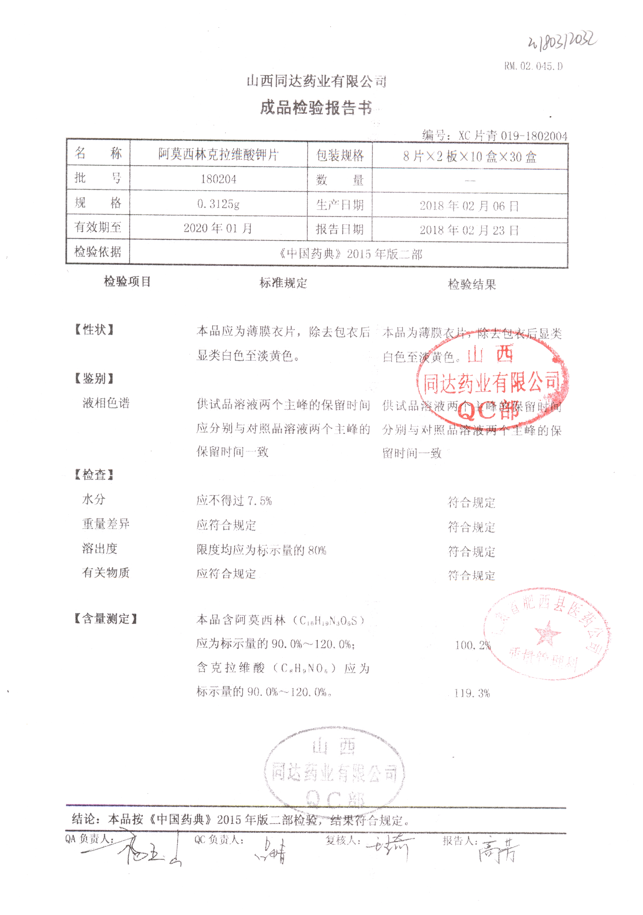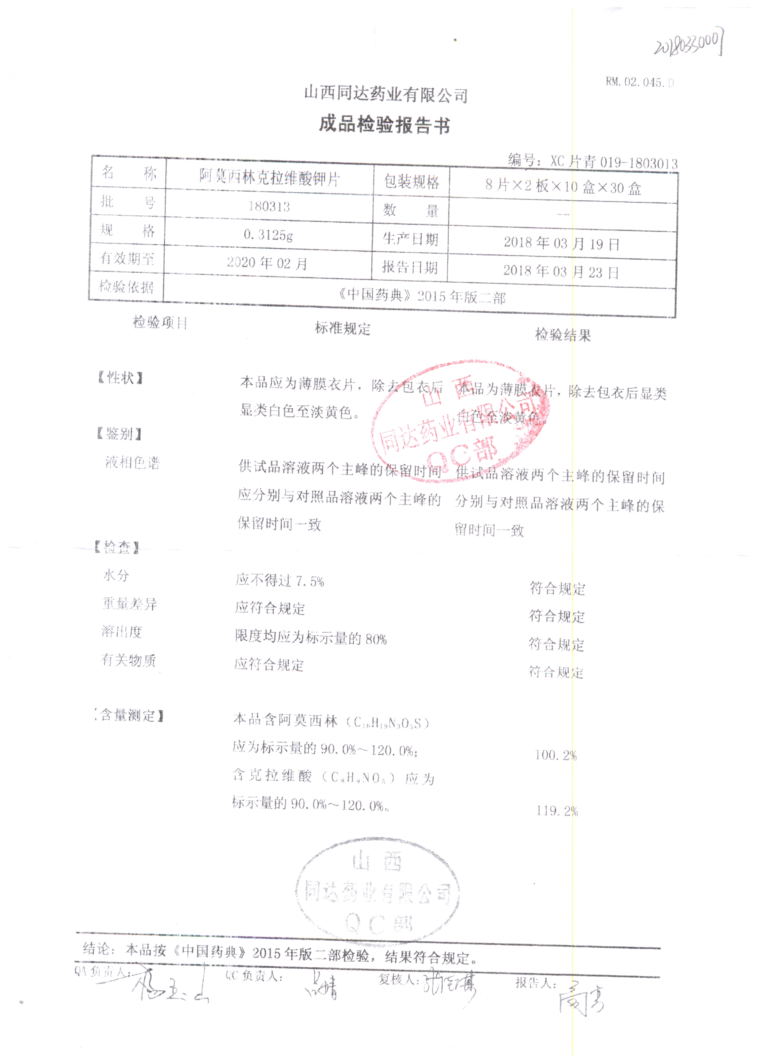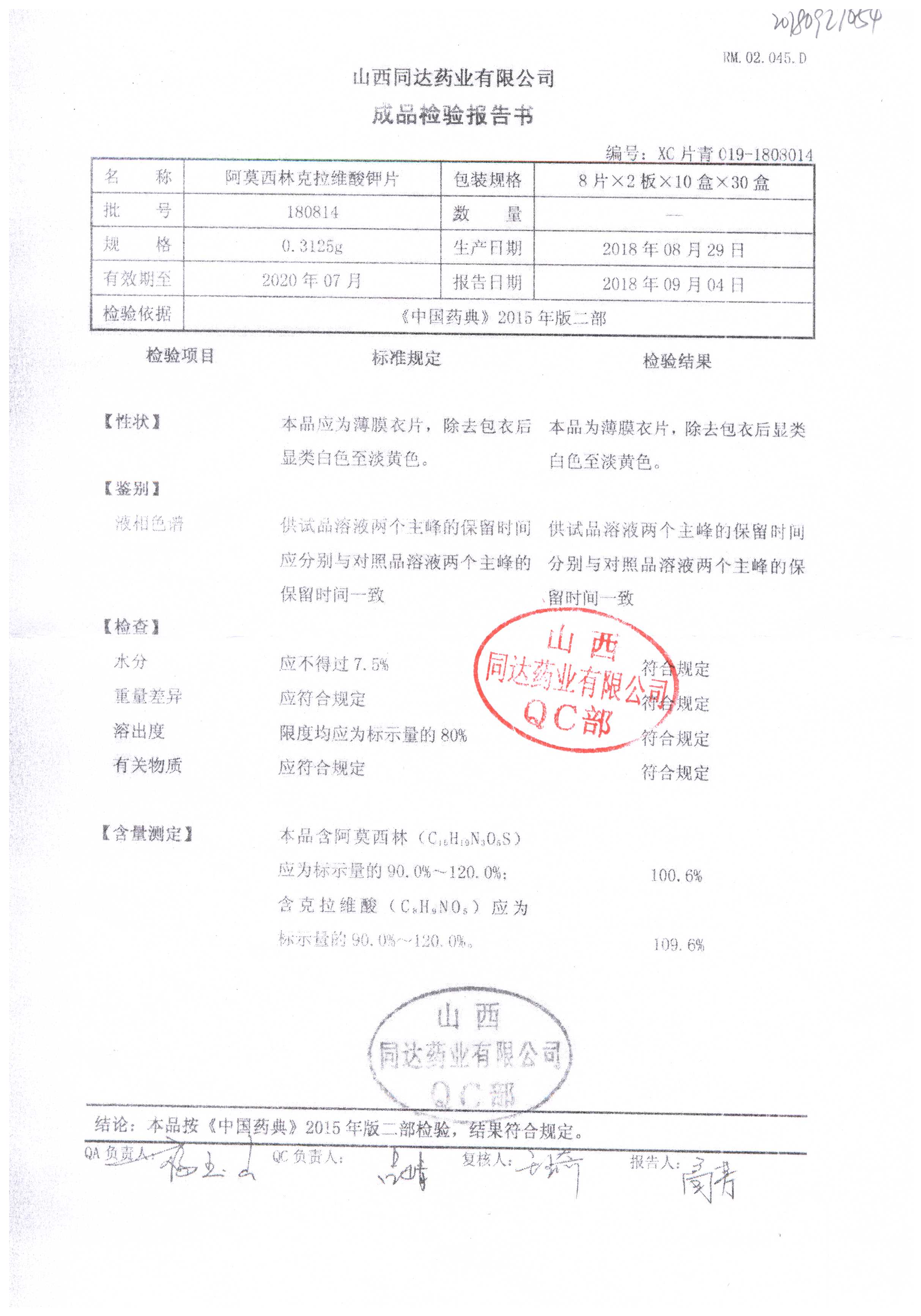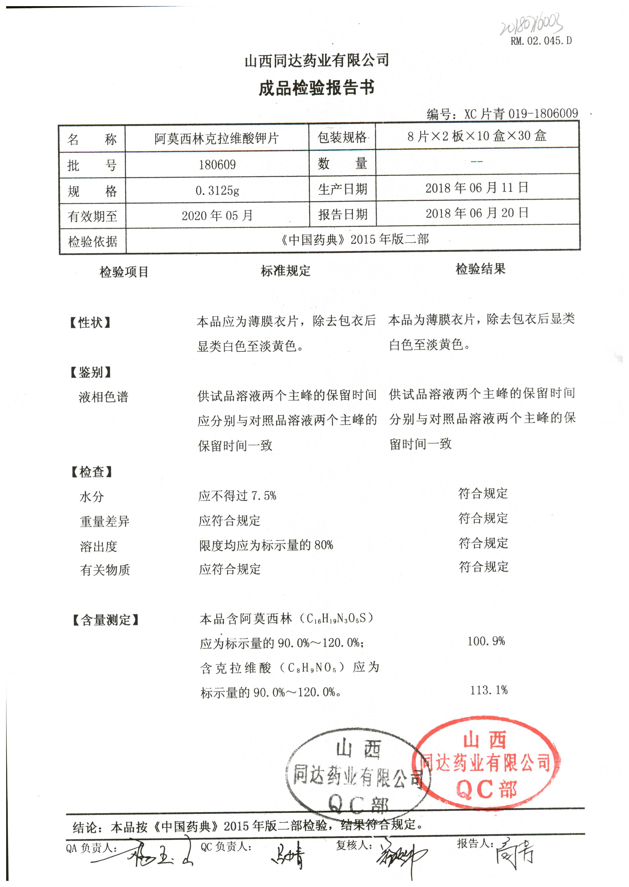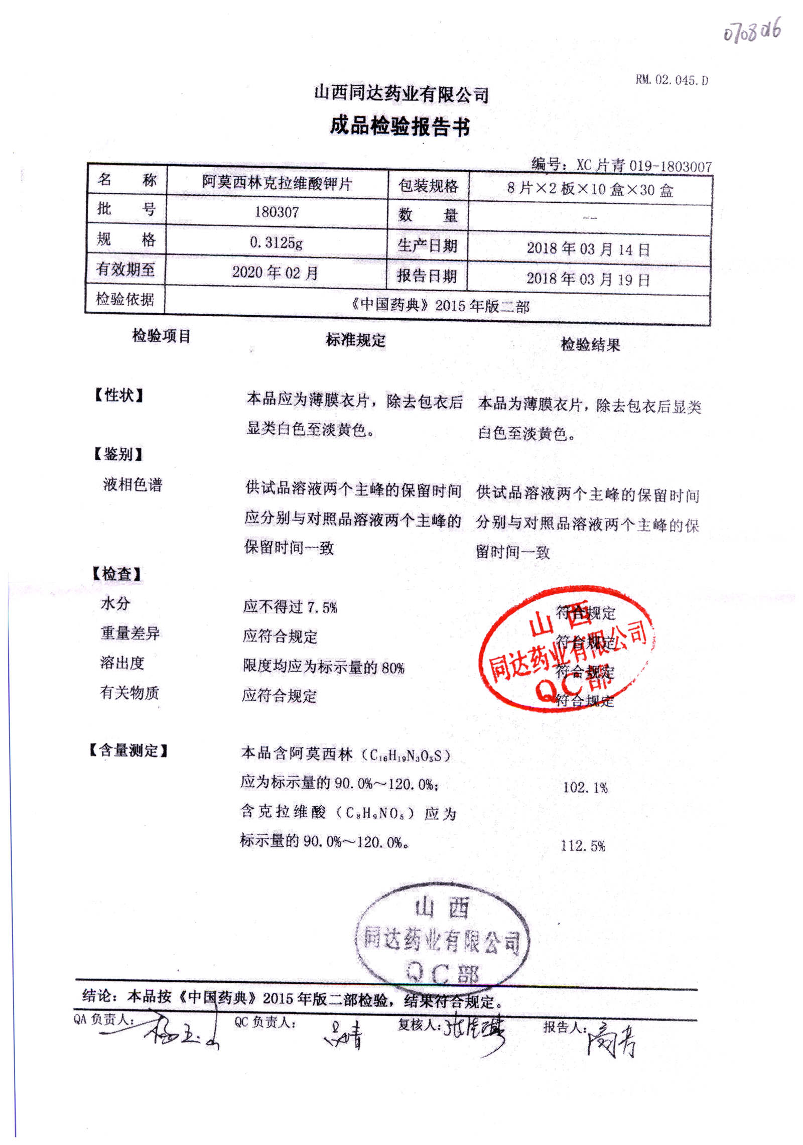 | 阿莫西林克拉維酸鉀片 | 0.3125g*16s | 180806 | 查看詳情 |
