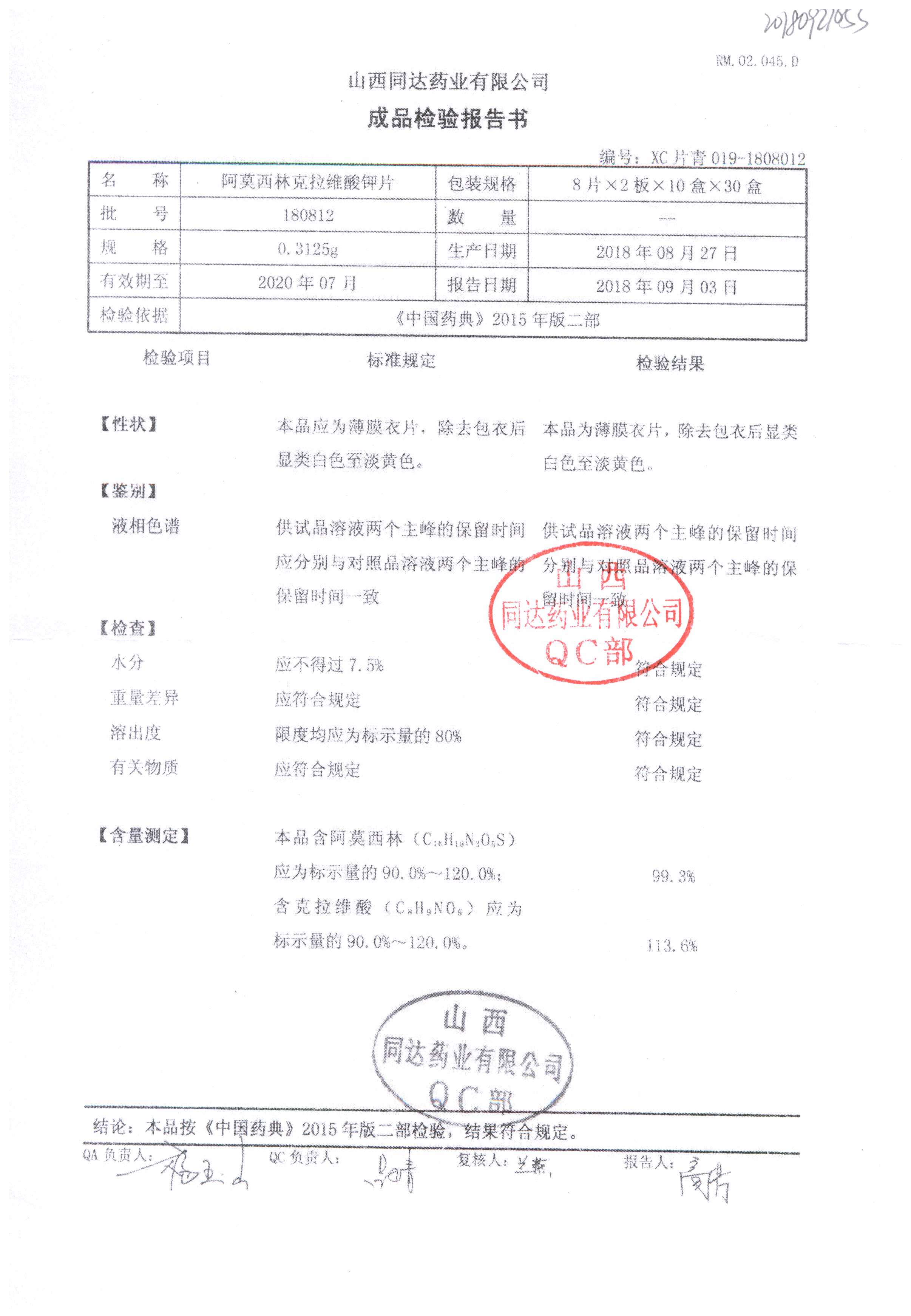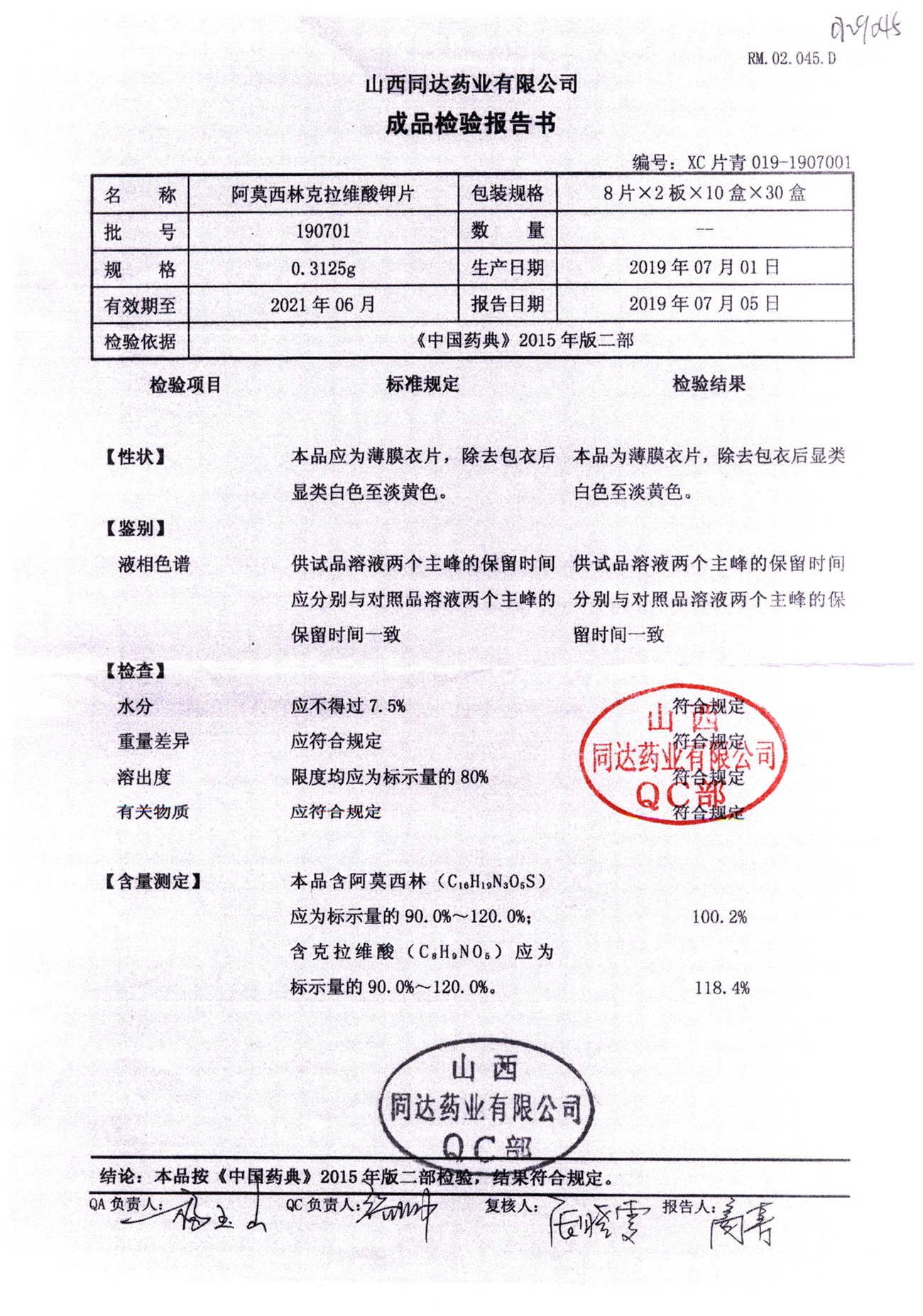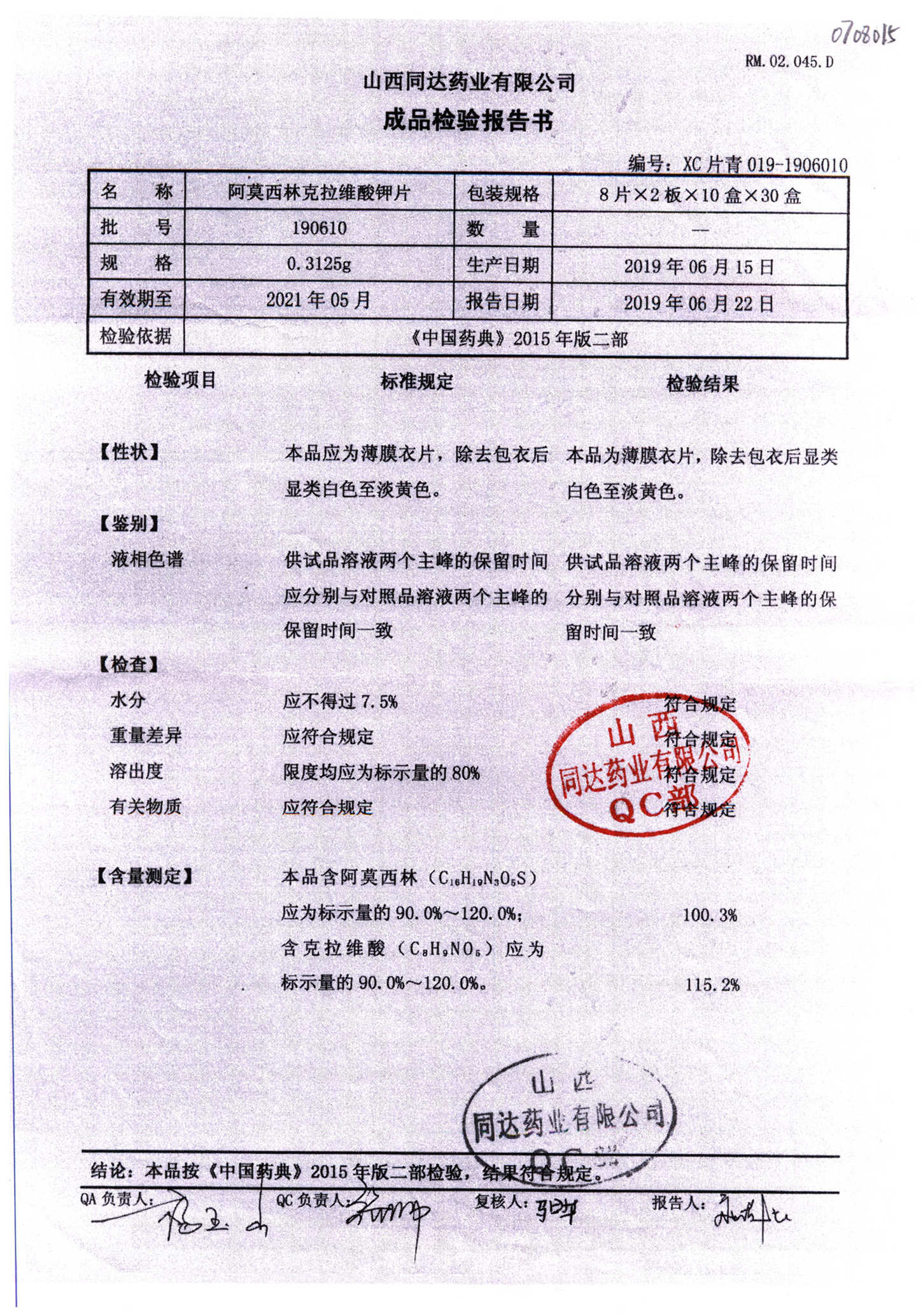 | 阿莫西林克拉維酸鉀片 | 0.3125g*16s | 190701 | 查看詳情 |