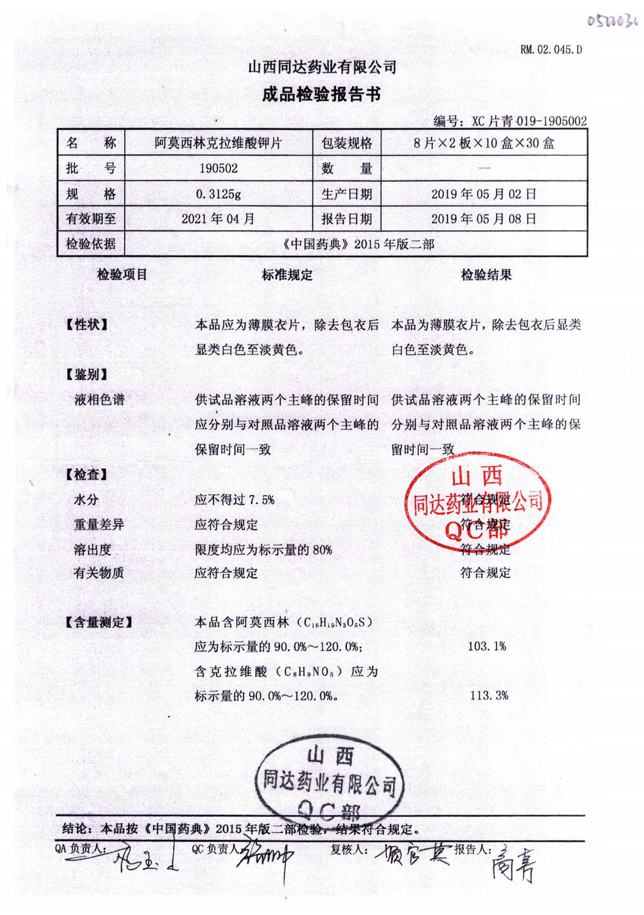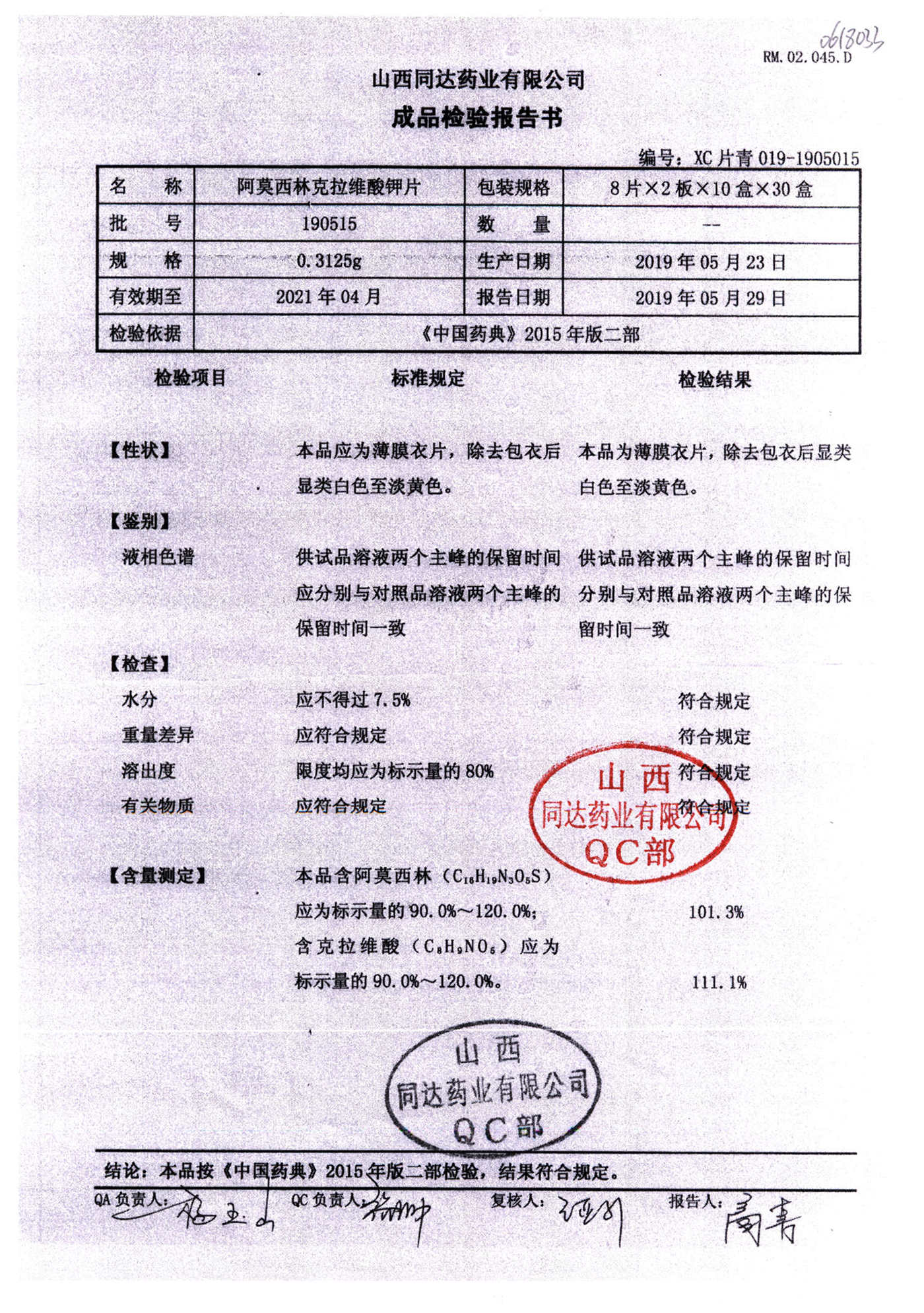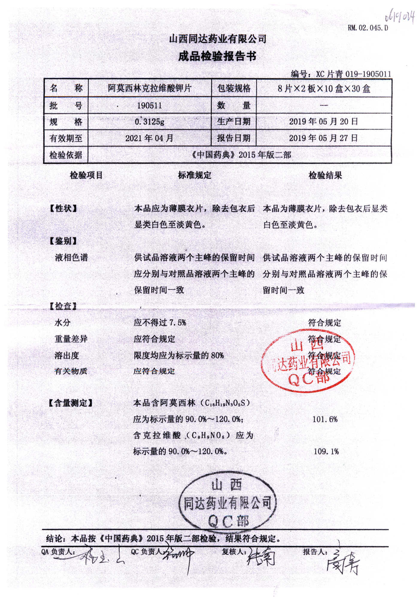 | 阿莫西林克拉維酸鉀片 | 0.3125g*16s | 190511 | 查看詳情 |