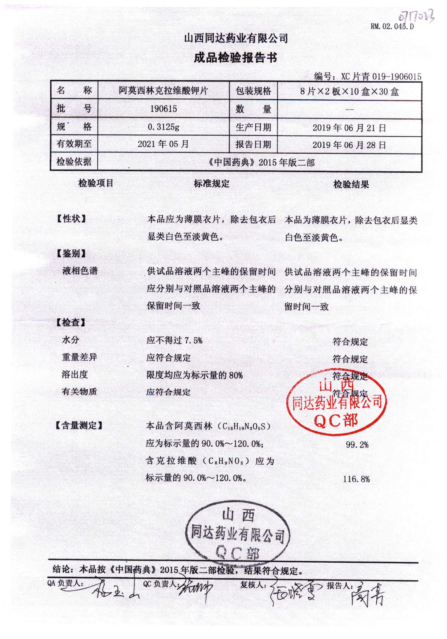 | 阿莫西林克拉維酸鉀片 | 0.3125g*16s | 190619 | 查看詳情 |