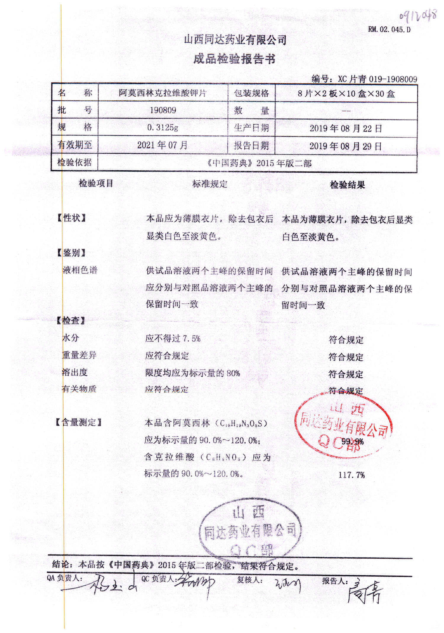 | 阿莫西林克拉維酸鉀片 | 0.3125g*16s | 190811 | 查看詳情 |