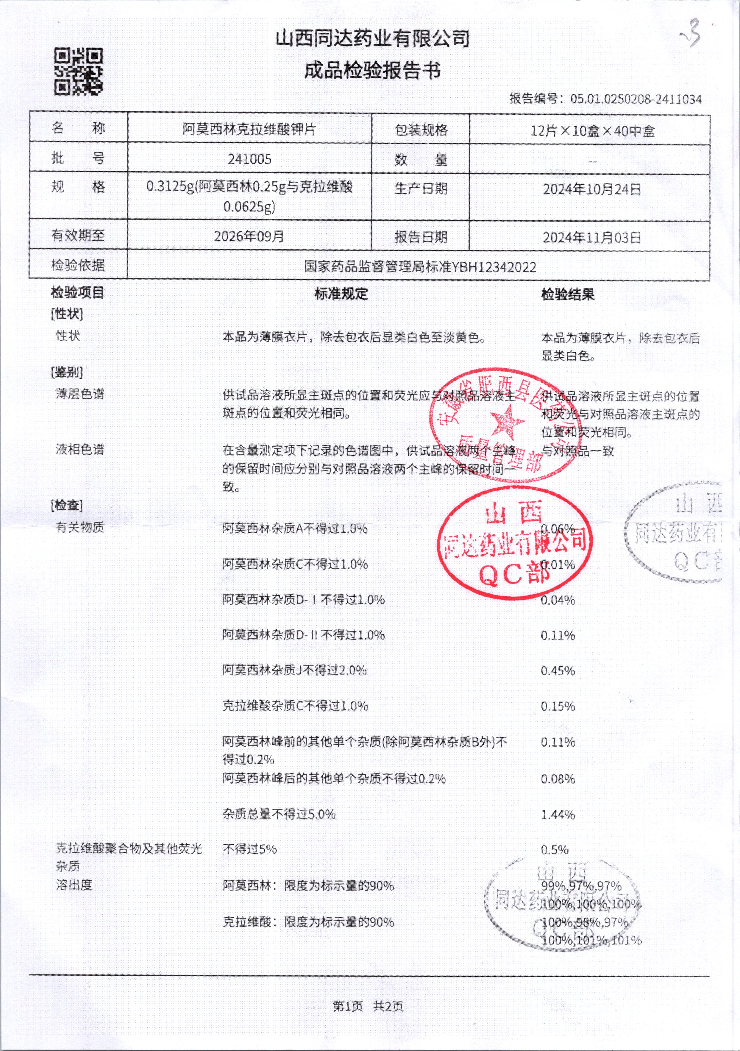 | 阿莫西林克拉維酸鉀片 | 0.3125g*16s | 191001 | 查看詳情 |